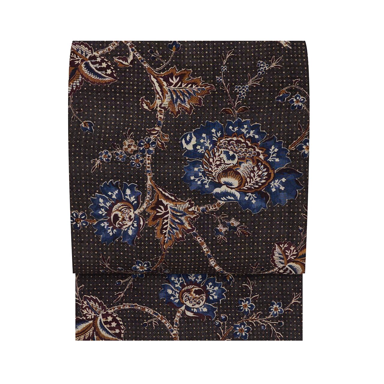 緯に節のある細い糸の座繰りの生紬のような生地が、墨色の黒・消炭色に染められ、極小のお花と小さな丸の模様が染められた地染めに、大胆な調子の唐花模様の更紗が描かれた、とてもお洒落な雰囲気の九寸の開名古屋帯です。