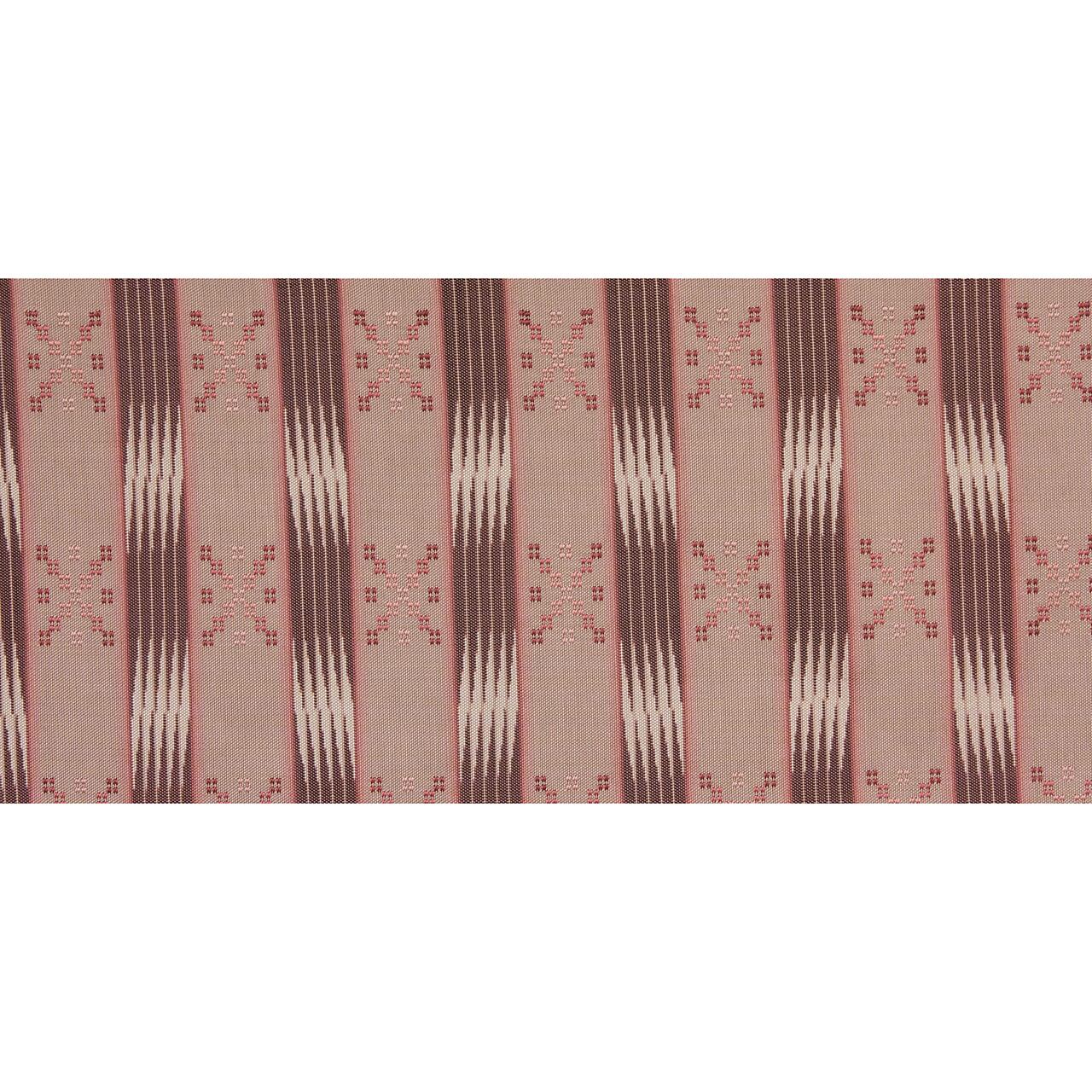 インド茜で染められた淡いピンクから朱系の色の濃淡がとても綺麗で、ジグザグの絣の白がポッと灯りがともったようにふんわりと存在を表している、バランスの取れた素敵な作品だと思います。