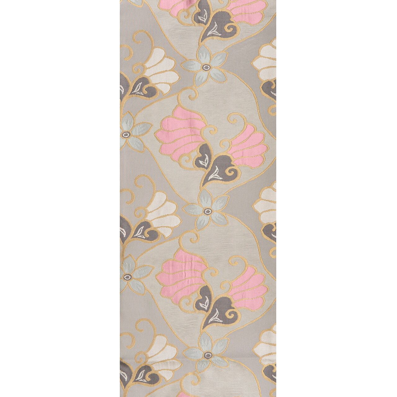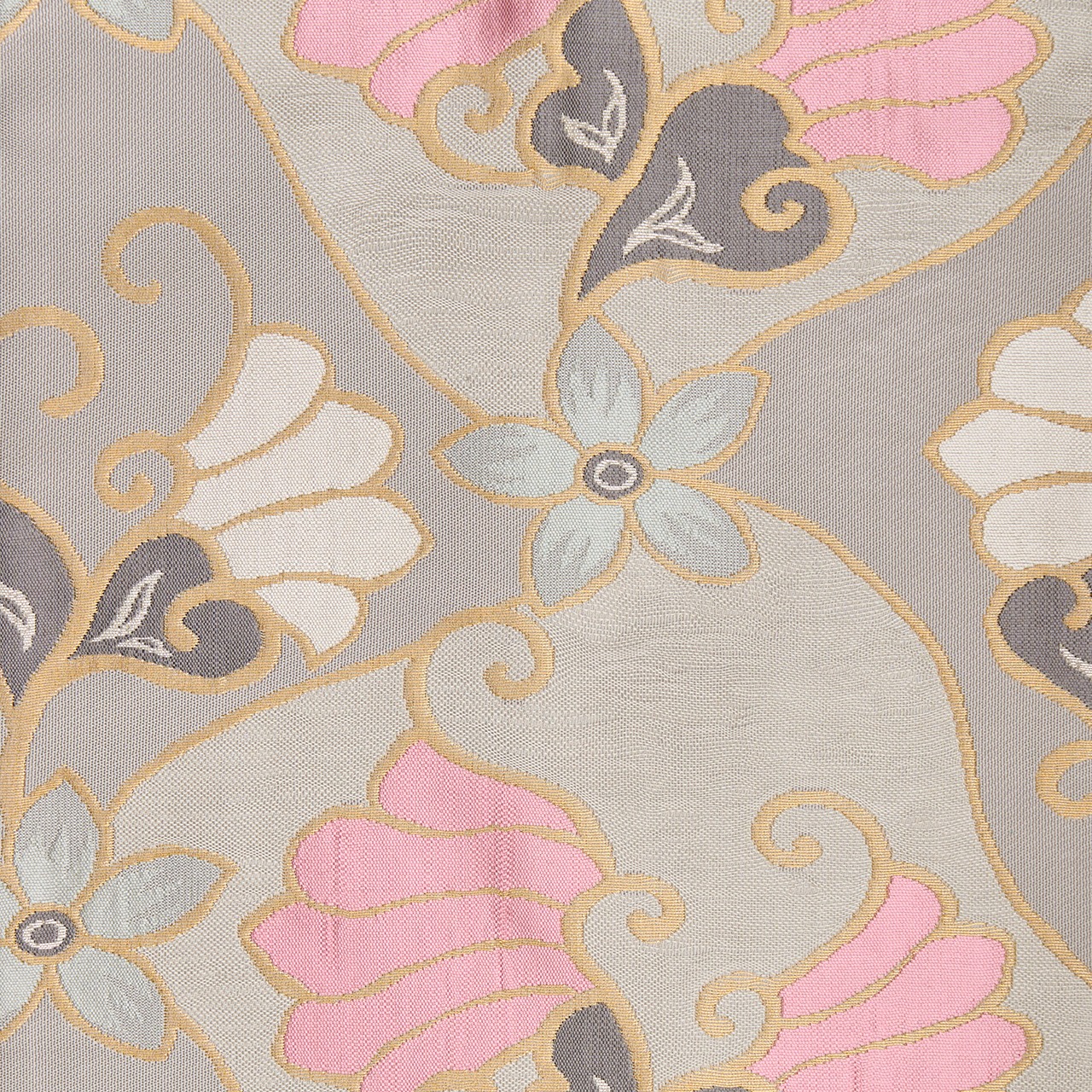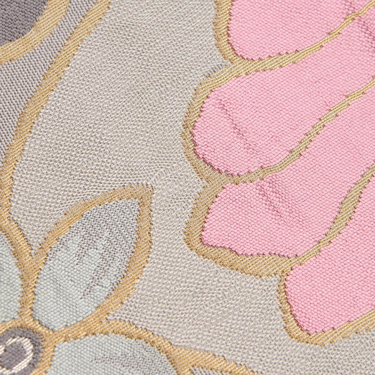 甘さのある綺麗なグレー・絹鼠色の地に、それより少し淡い同系色で四角が斜めに取られ、それを繋ぐところには薄雲鼠色の5枚の花びらのお花が置かれ、四角の中には天使の羽のような形をしたマグノリアのお花が織り出された、とても洗練された素敵な雰囲気の洛風林さんの九寸名古屋帯です。