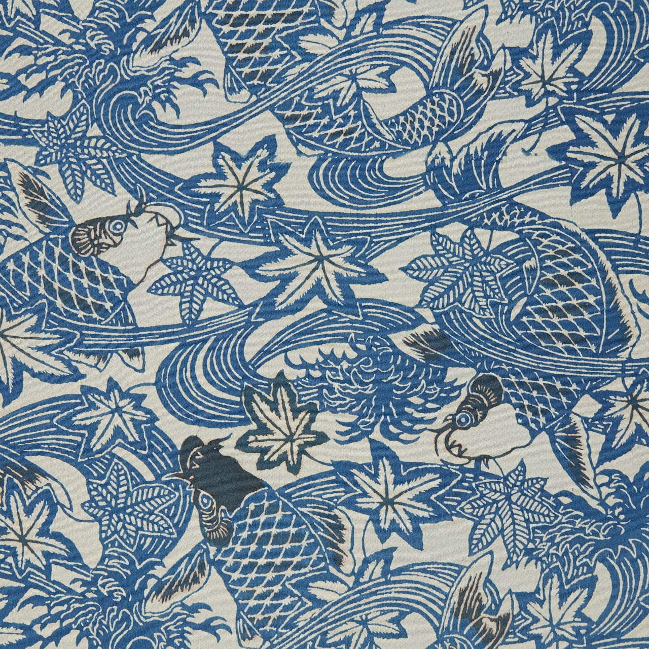 こちらは裏に染められた藍色が浸みて、表がややグレー味のある水色になった白花色の一越ちりめんの生地に、躍動感のあるラインで水の流れが取られ、そこに堂々とした存在感のある鯉が泳ぎ、紅葉の葉が散らされた、力強い印象の図案の九寸名古屋帯です。
