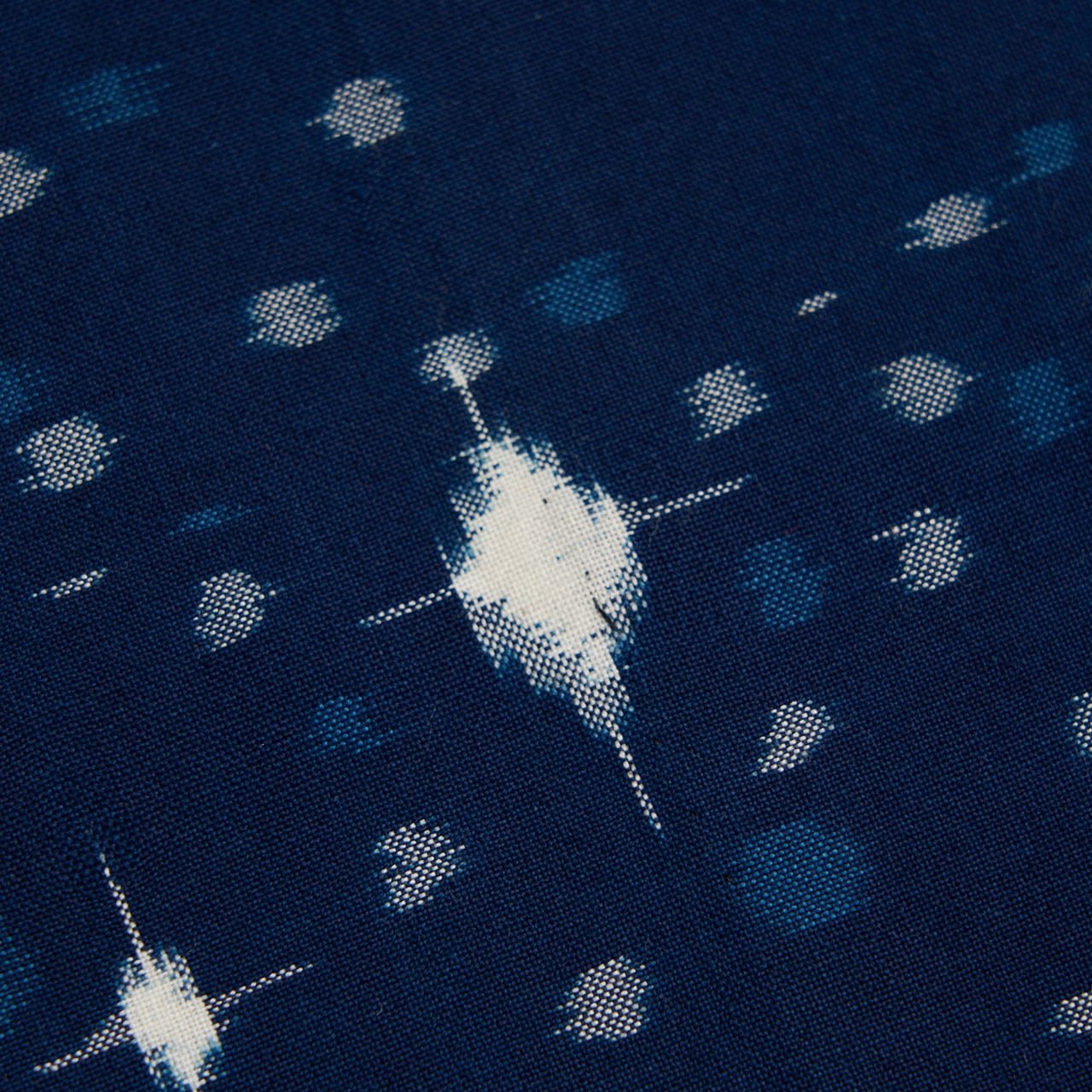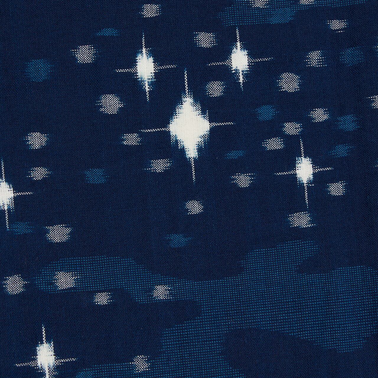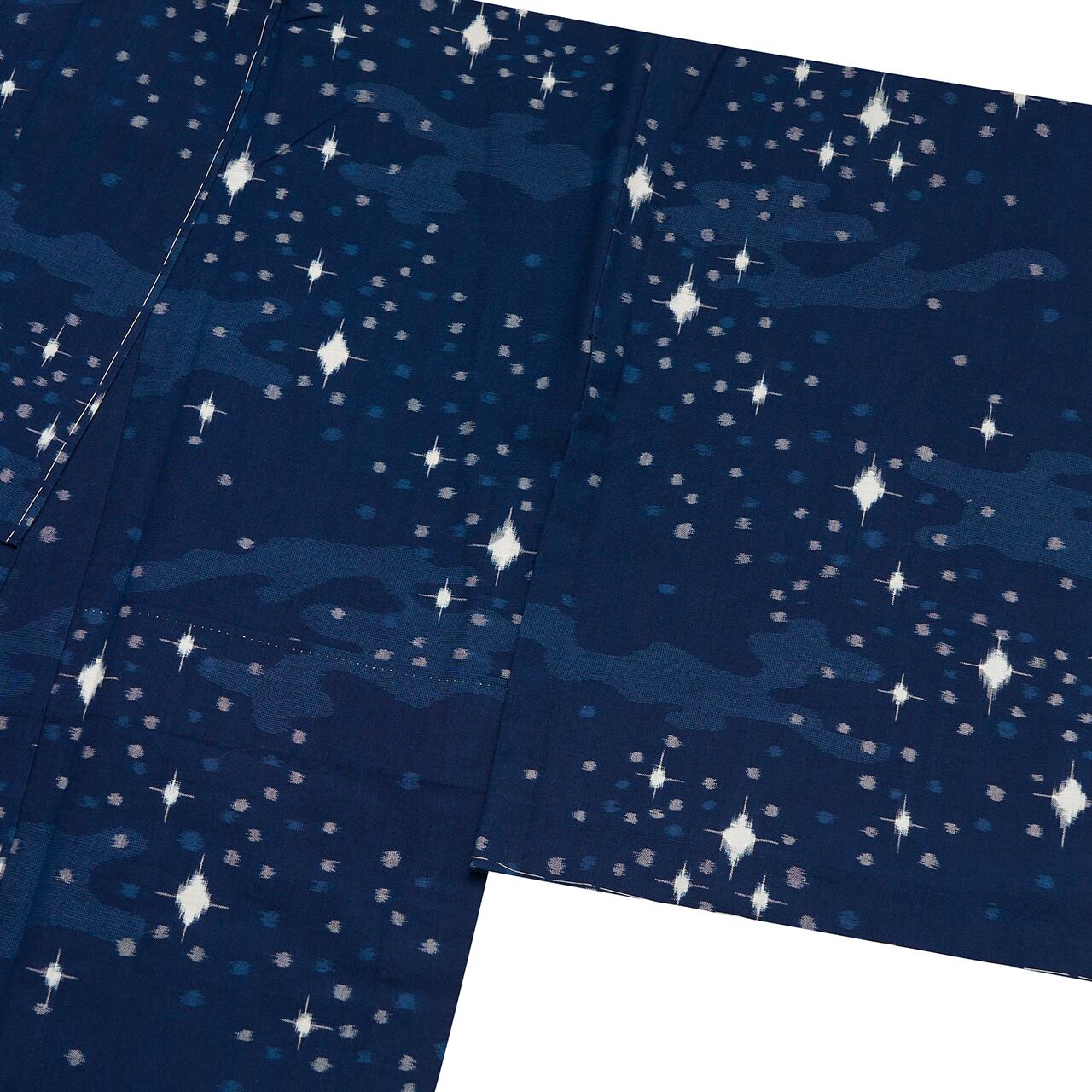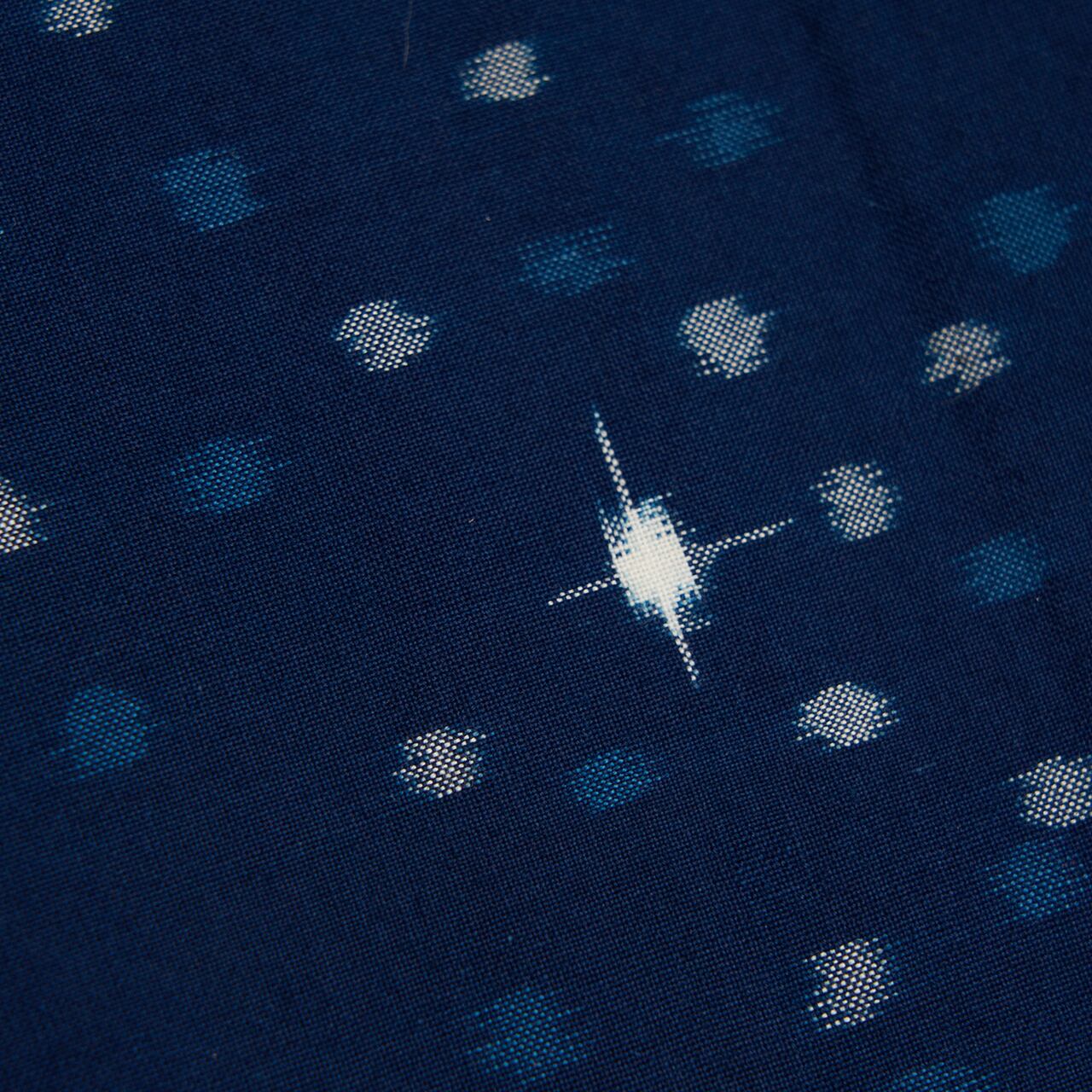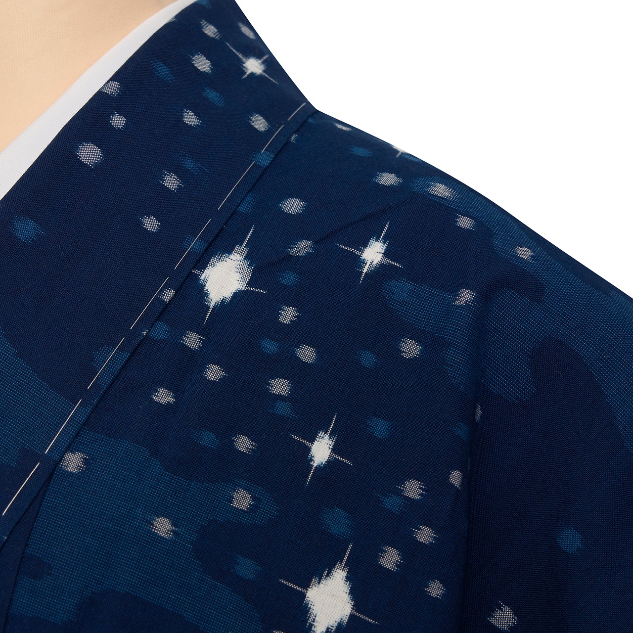 こちらのお着物は、まず深い藍色に煌めく星のような大小の白い絣が目に飛び込んできます。