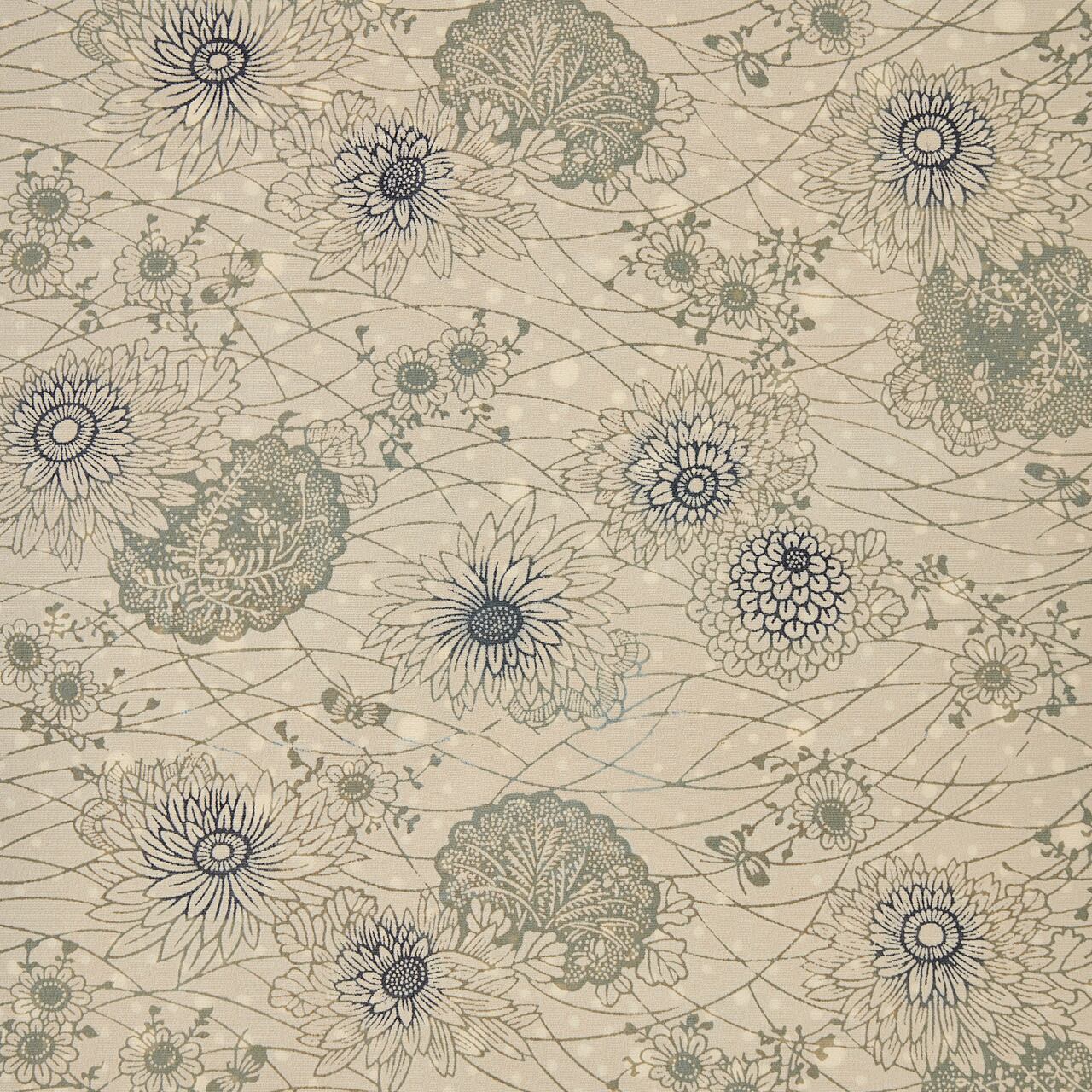 糊置きをして色止めをされた部分は、藍甕に浸けて染めても白く残りますが、こちらはその白の部分が多い「地白型」といわれるもので、糊置きの面積が多くなりますし、染められた部分も非常に細かい線があり、花びらなどの模様も複雑で、難易度の高い作品です。
