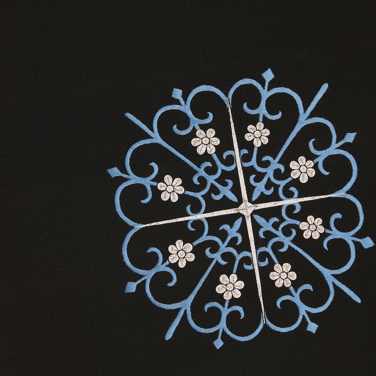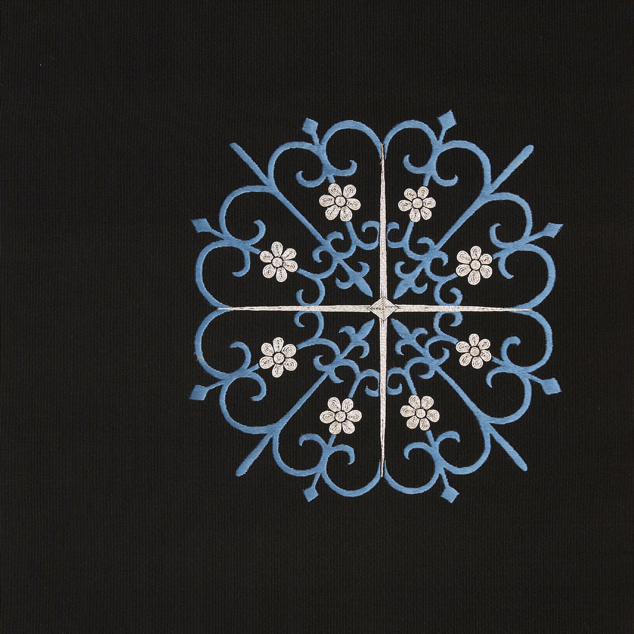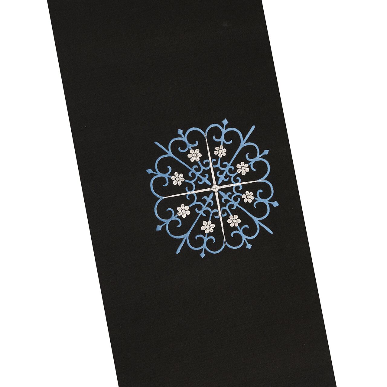 しっかりとした打ち込みの黒の綴れ織の地に、お太鼓には薄花色の糸で大きなお花の輪のような模様が描かれ、中心には細い銀の駒糸で、十字の模様と小さなお花が刺繍された、どこかクラシックな雰囲気のある、川島織物さんの素敵な八寸名古屋帯です。