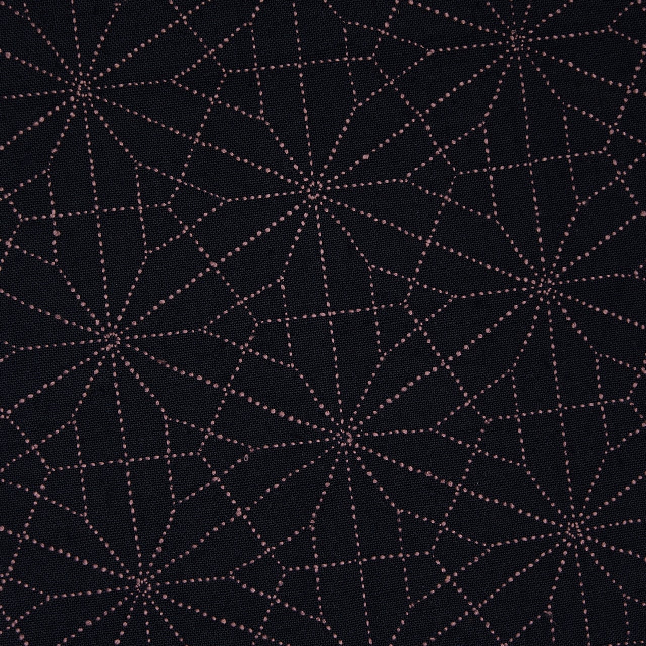 濃い藍染の木綿の生地に、やや明るい淡い赤紫・鳩羽鼠色の糸で、亀甲に花のような、変り麻の葉のような模様が全面に刺し子で表された、手仕事の味わいの感じられる、とても珍しい吉田英子さんの九寸の開名古屋帯の作品です。