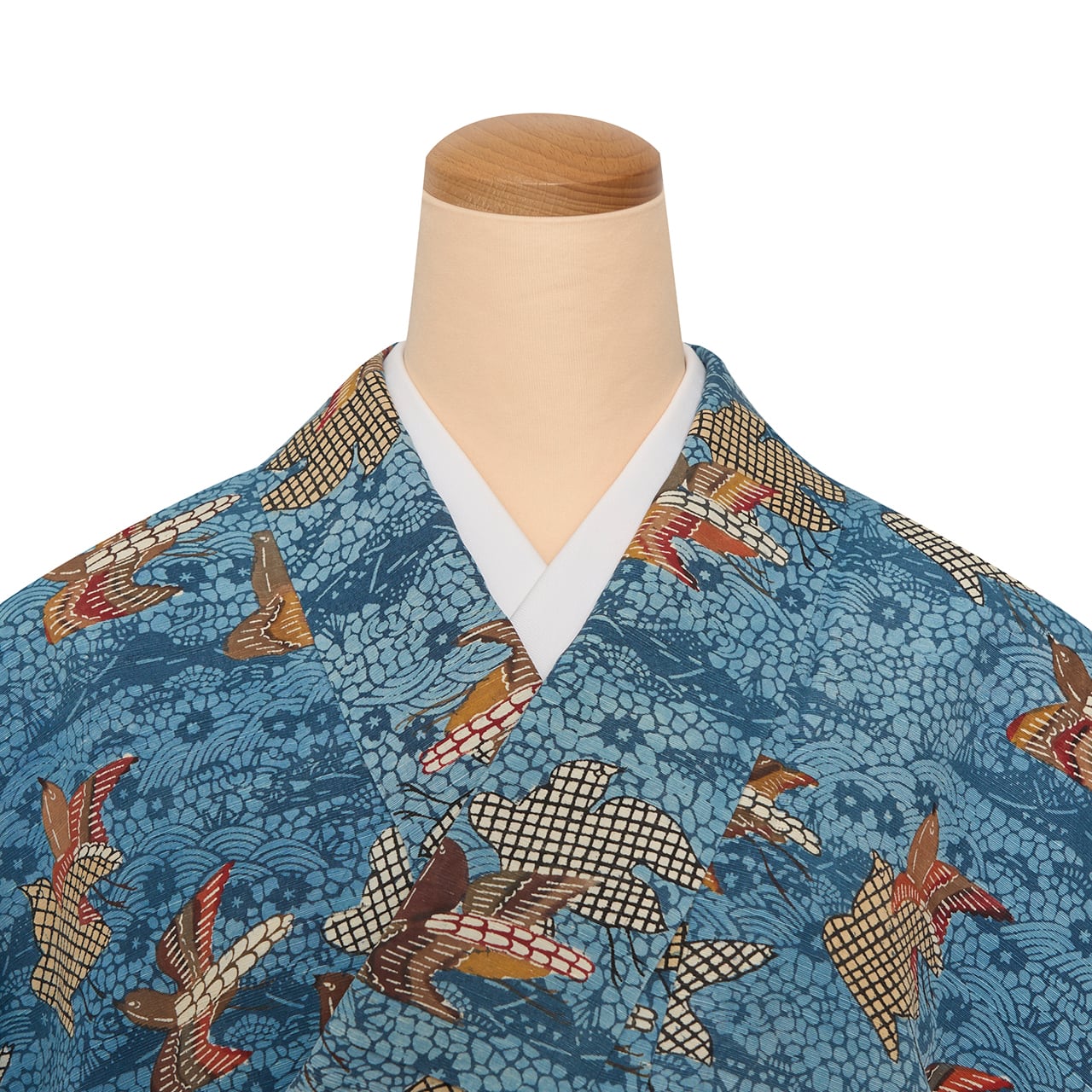 地の透明感のある水色がとても爽やかで、飛ぶ千鳥も愛嬌のある表情となっていて、染めのレベルは高いのですが、重苦しさはなく快活な印象の、非常に魅力溢れる大変おすすめの珍しいお着物です。