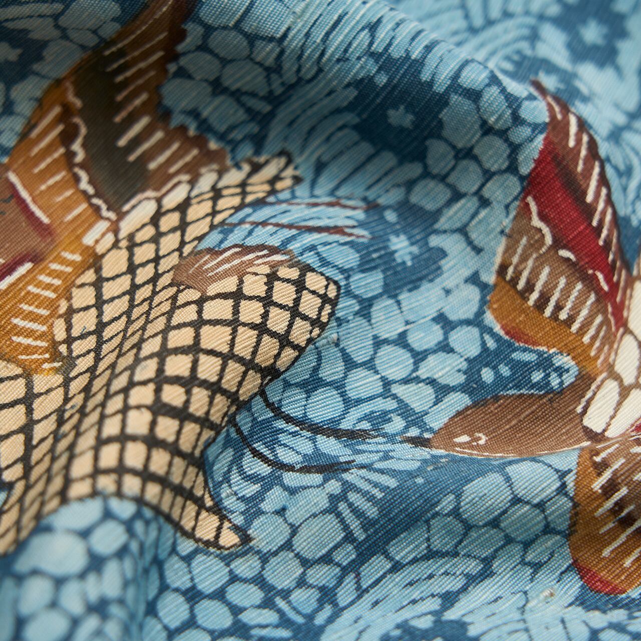 沖縄の古紅型の衣装などを彷彿させるような味わいのあるもので、驚く事に朧型(おぼろがた)の技法で染められています。