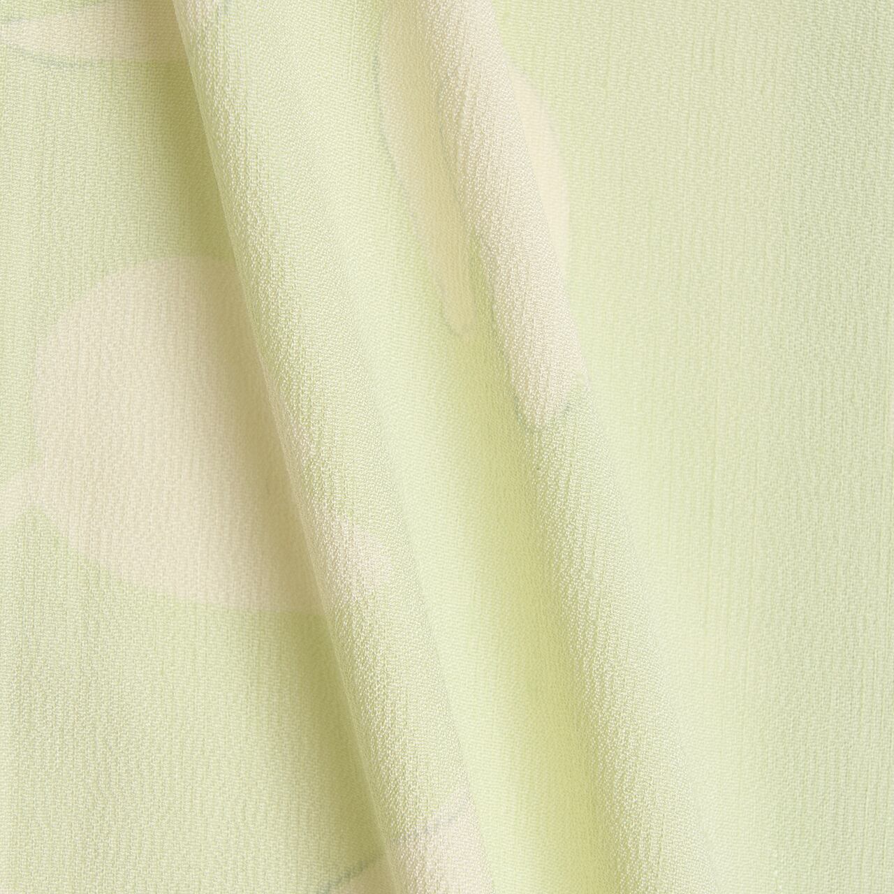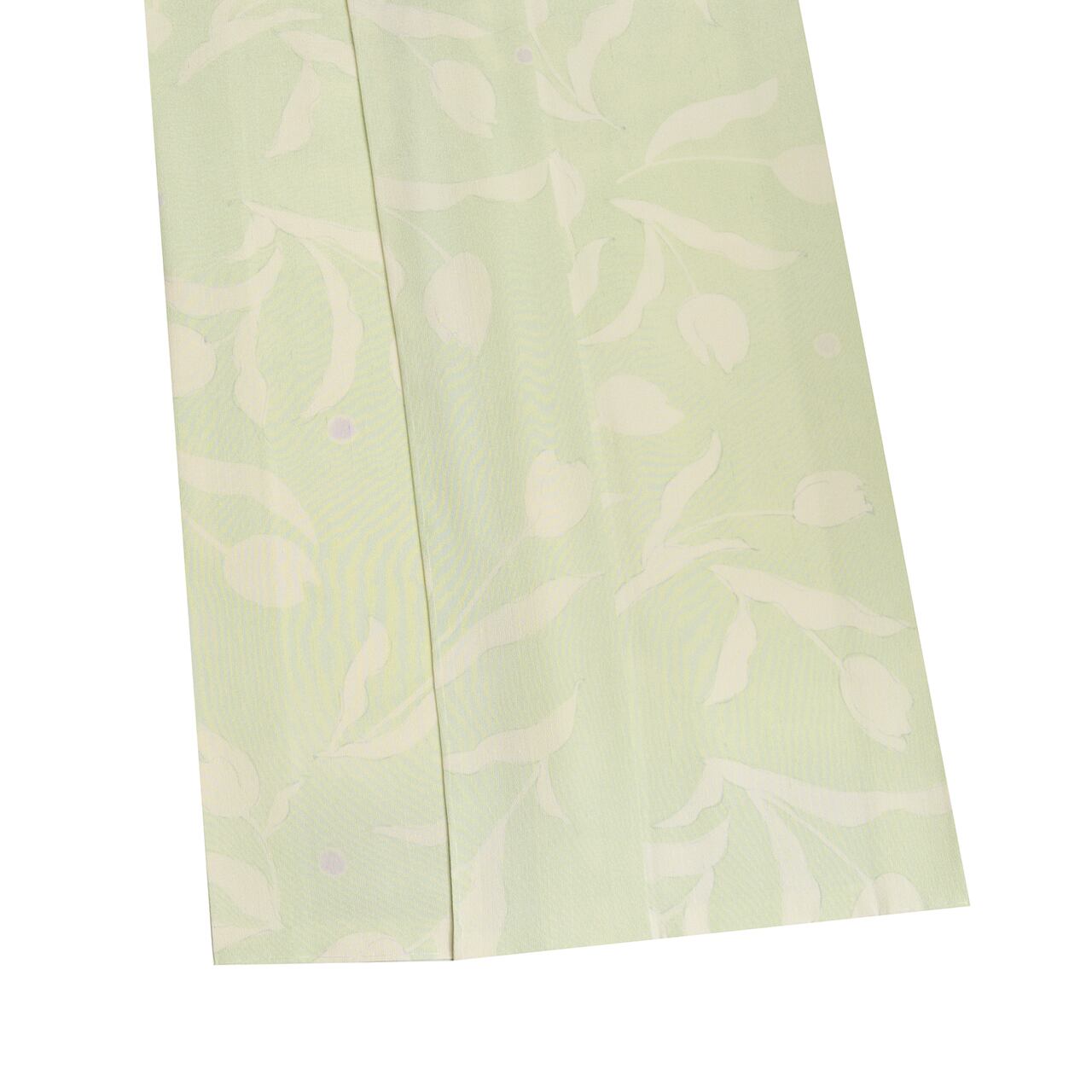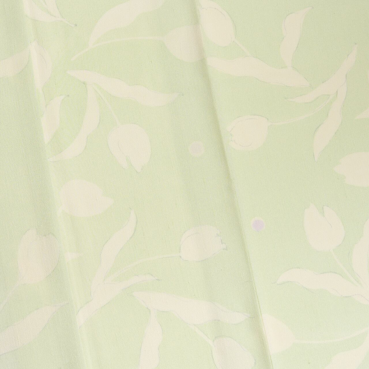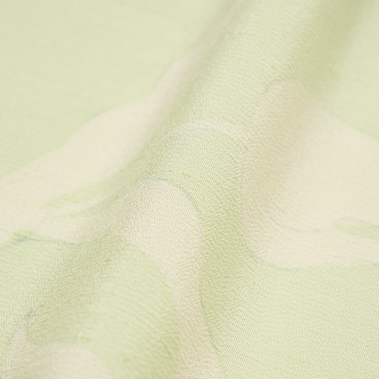 地の若葉色は淡く彩度の高い色ですが、一越ちりめんではなく紬ちりめんに染められている事で、あまり光りすぎずやや抑えられた発色になっています。
