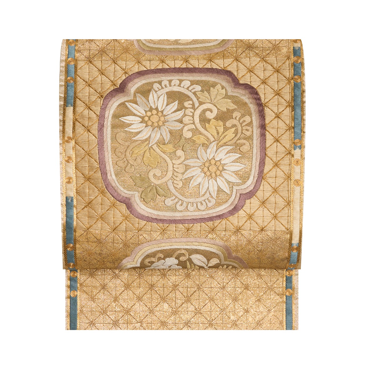 とても細かい紗綾型の地模様が極細の金箔の糸で織られた、柔らかくしなやかな佐賀錦のような地に、お太鼓やタレには種類の違う細い金箔の糸で斜め格子の様な模様が織り出され、お太鼓の中心になるところはその模様に合わせて同じ柄が手刺繍され、それを背景に、大きな角の丸い四角の枠がやはり刺繍で取られ、その中に唐花模様の花唐草が刺繍された、大変手の込んだ豪華な袋帯です。