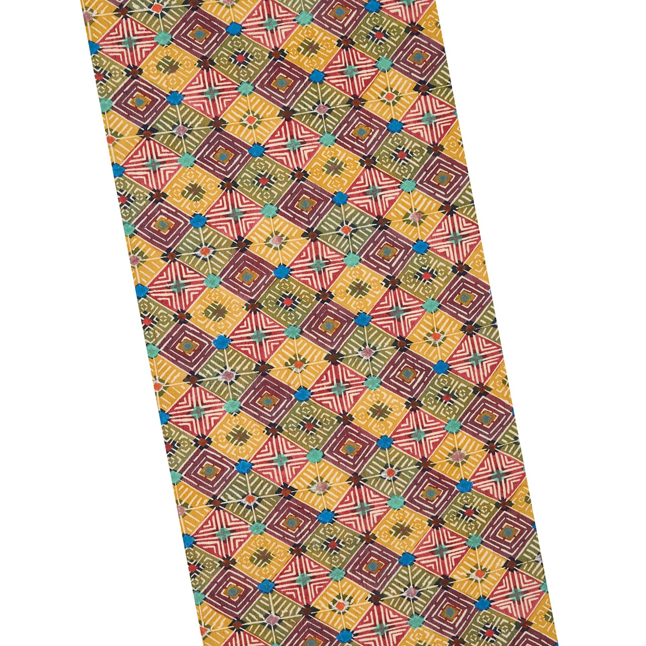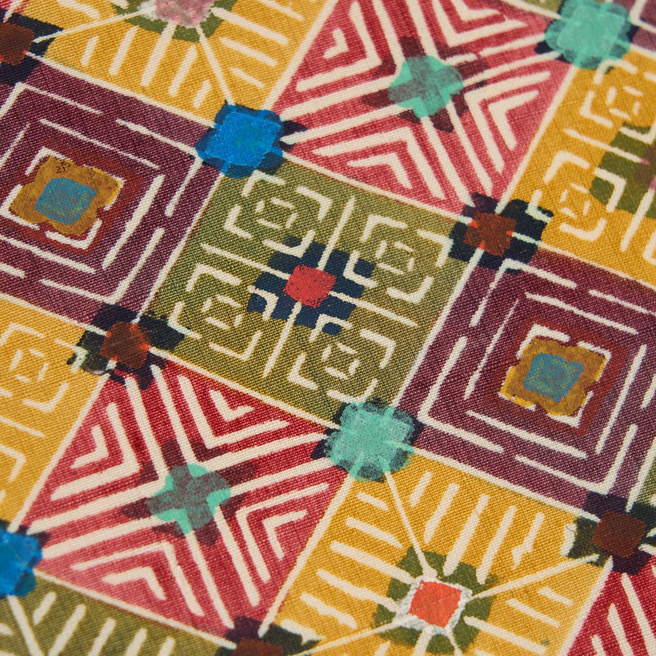 モダンさもある幾何学模様となっていますが、やはりどこか古い染織品にインスパイアされたような落ち着いた雰囲気もあり、熟練の高い技術を持って成された、手仕事による積み上げのような味わいも濃く感じられる素晴らしい作品です。