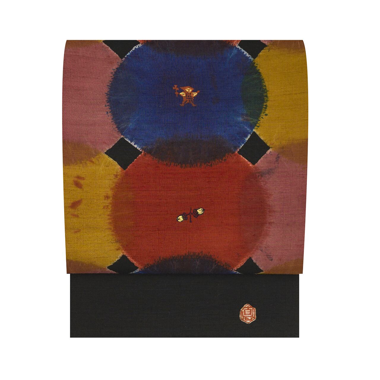 国画会会員 小島悳次郎 丸の絞りに型絵染 子どもの模様 開名古屋帯 【中古】