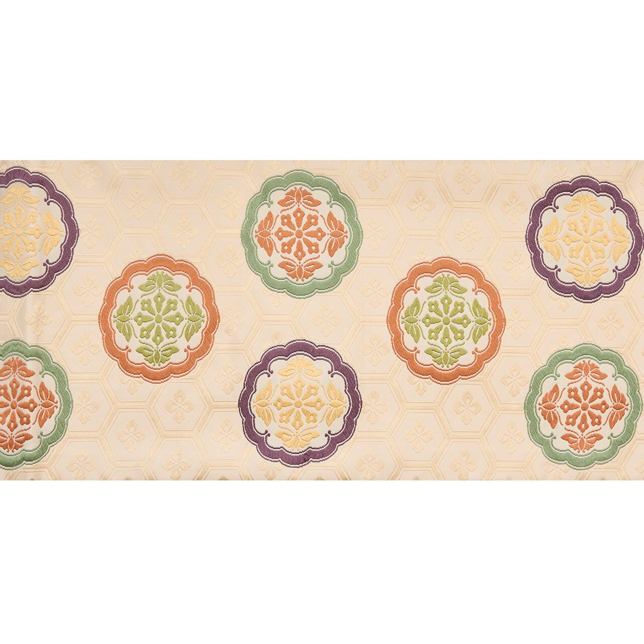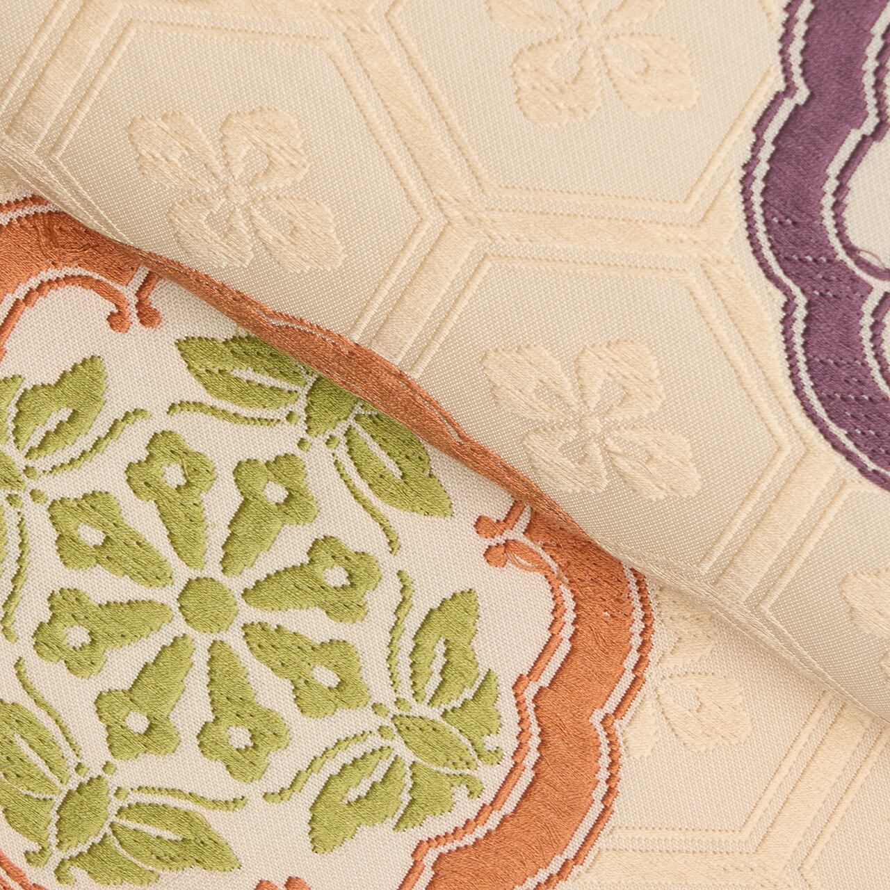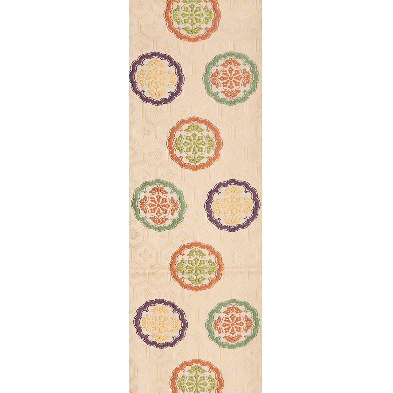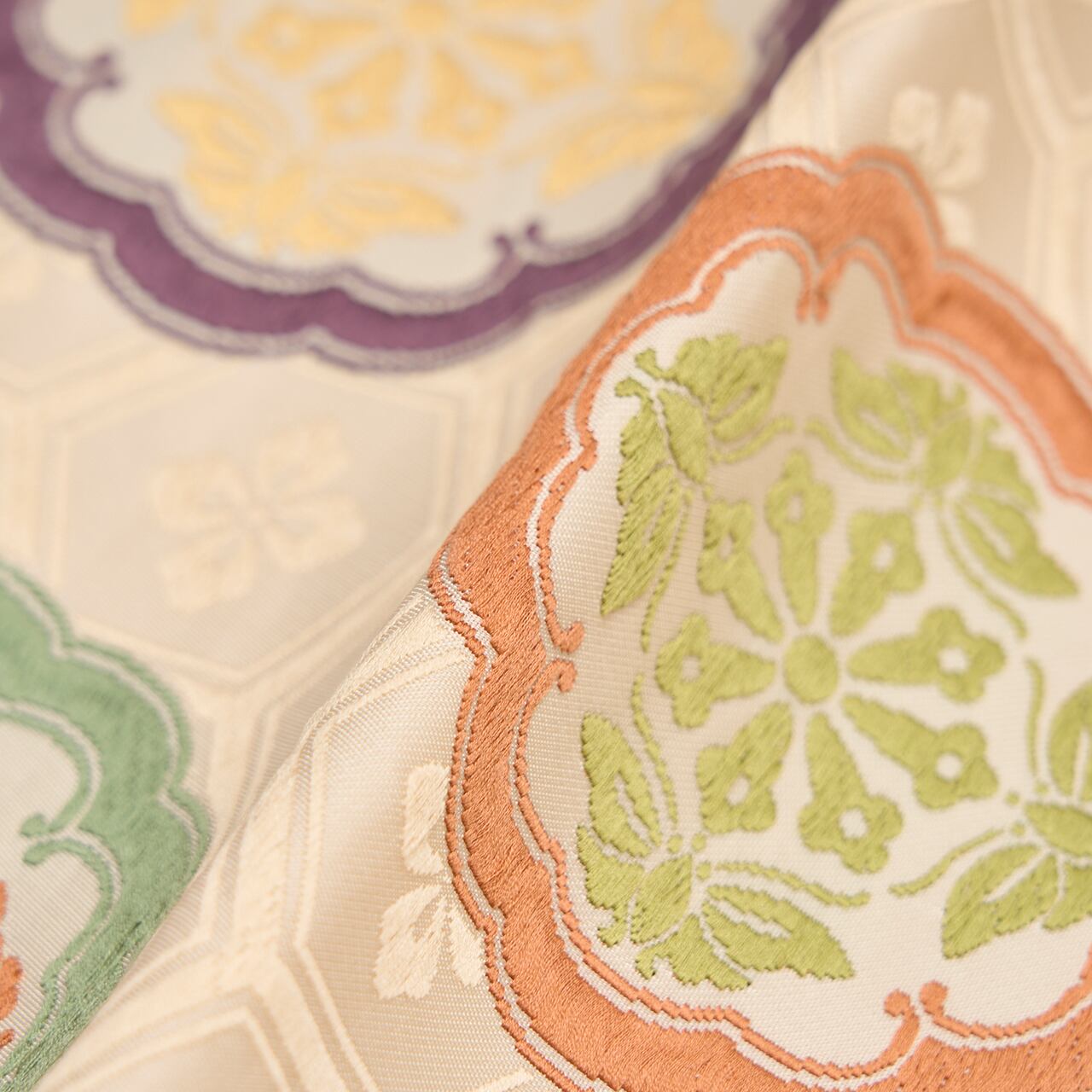 練色のシャリっとしながらもしなやかな質感の地に、同色の糸で花亀甲の文様が織られ、そこにいろいろな色の糸で窠文が織り出された有職文様の袋帯です。