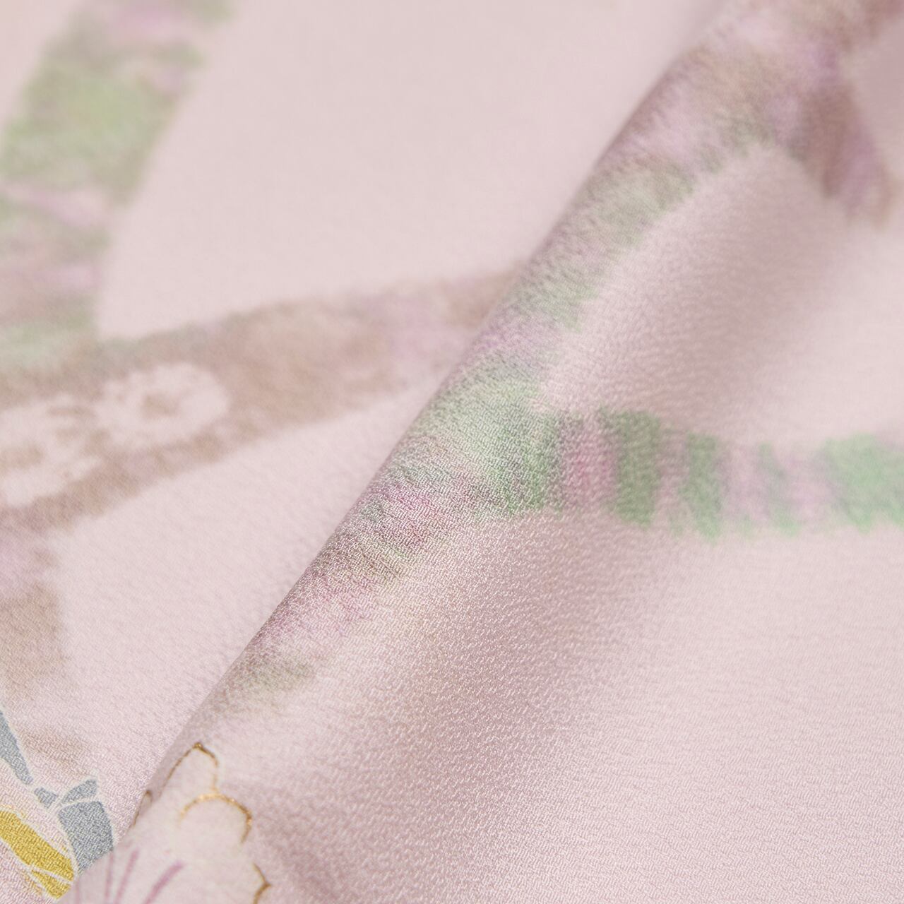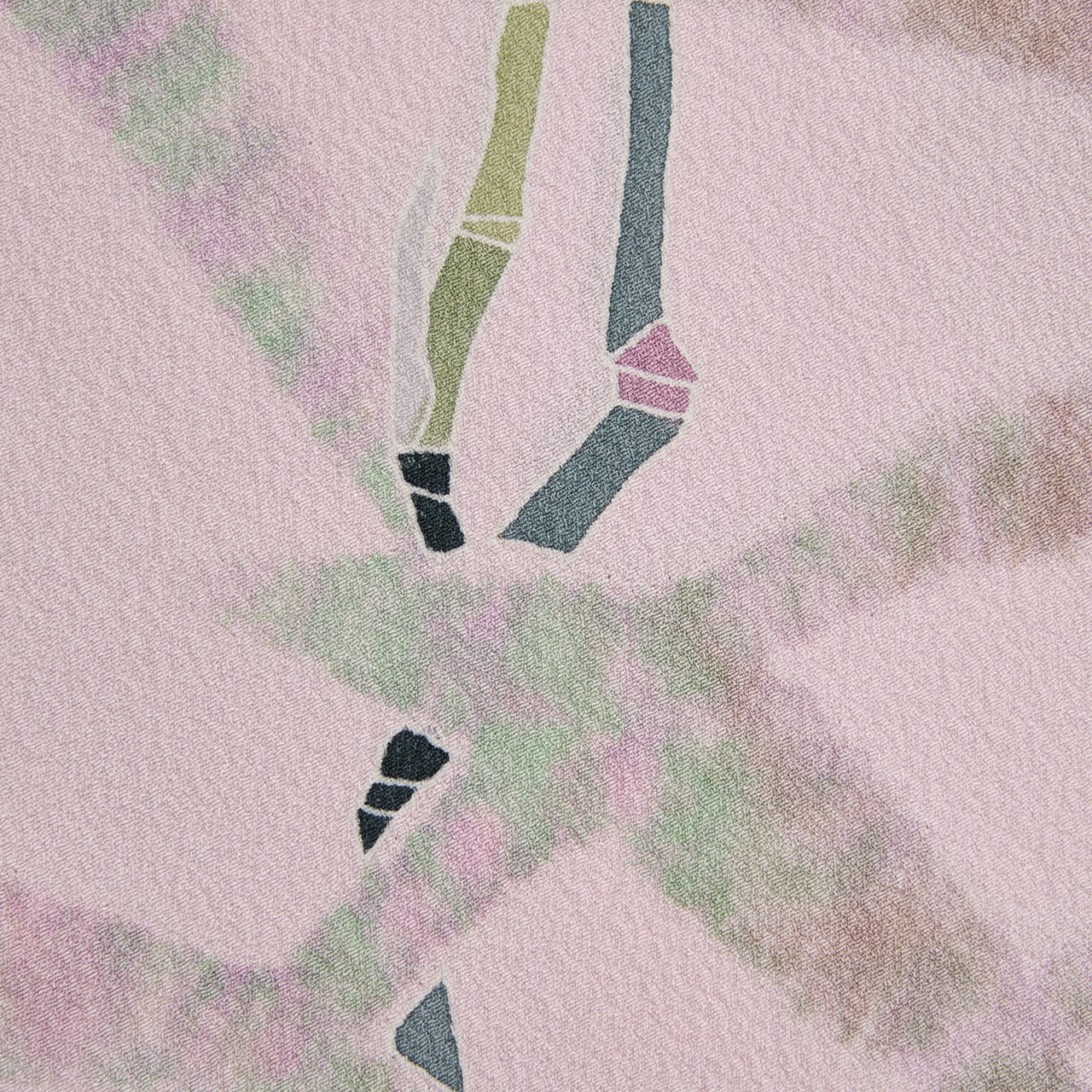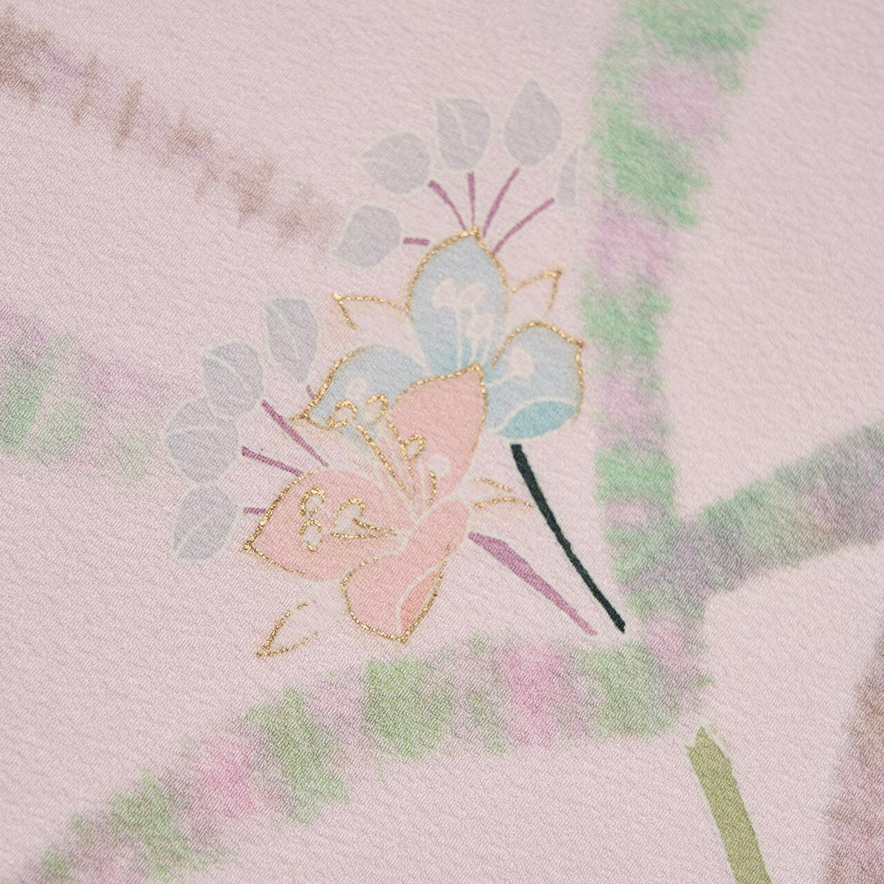 そのモワモワとした表現とは対照的に、手描きの友禅で描かれた茎とお花は、そこにピントを合わせた写真のようにも見えて、葉とお花の絶妙なコントラストにも遠近感の感じられる、素晴らしいデザインだと思います。