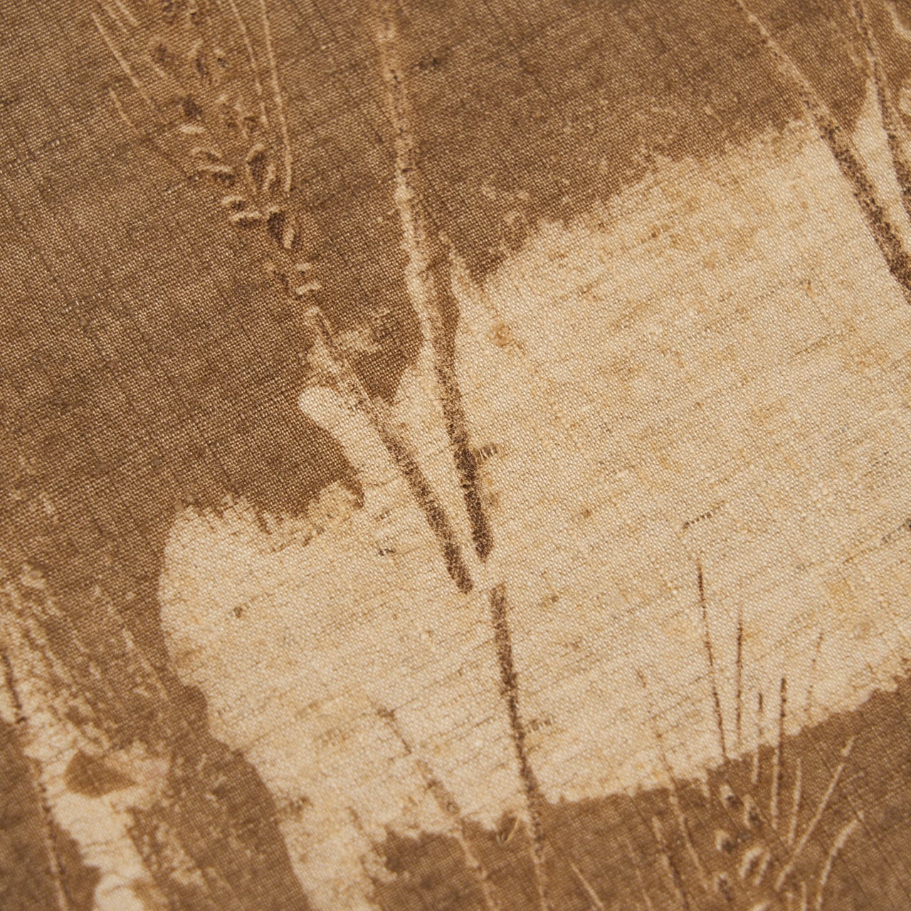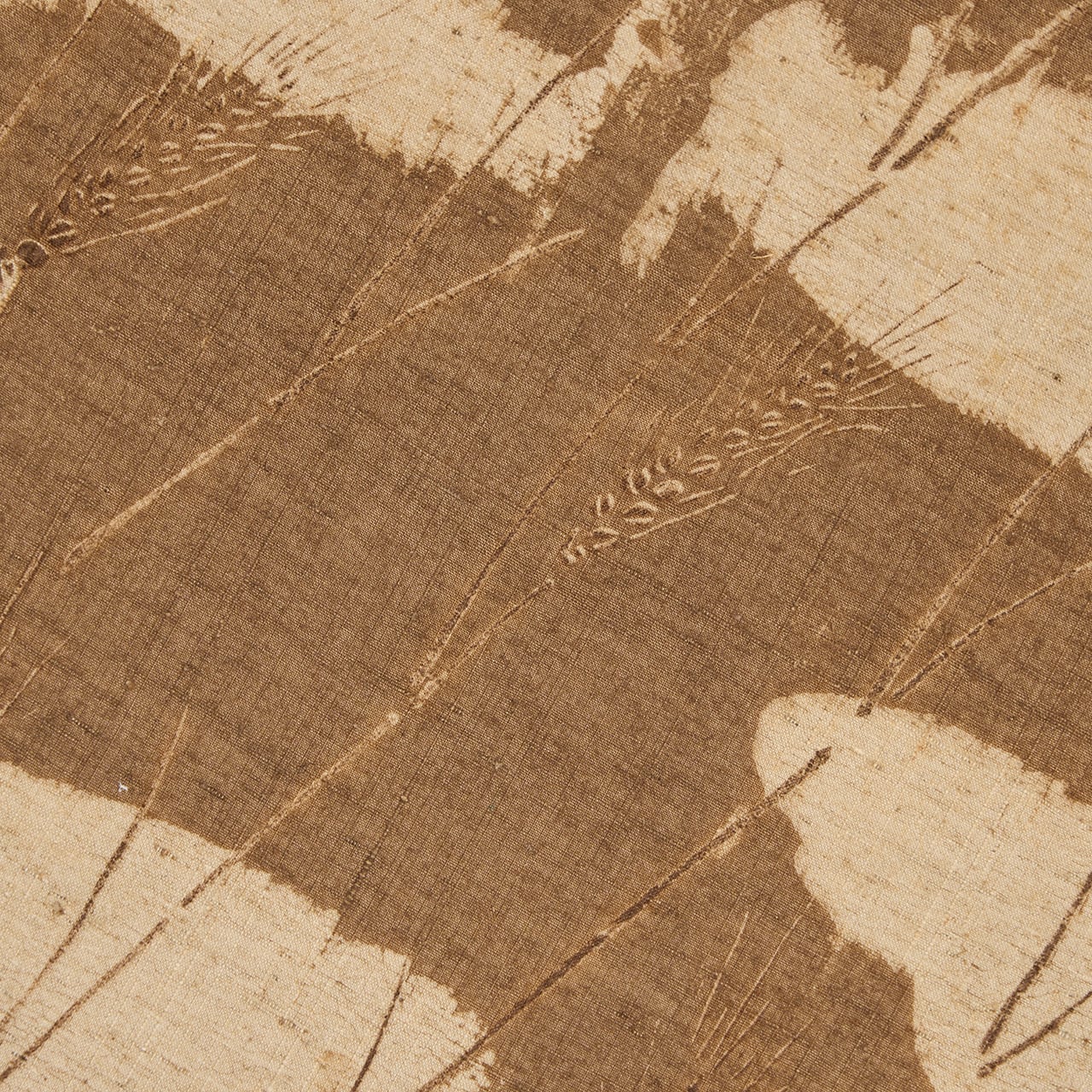 ラフな感じの蝋纈染めの雲の感じと、型染の少し写実的な麦の表現と、技法の違いでまるで麦にフォーカスが合わされているような、遠近感がとても面白く感じられます。