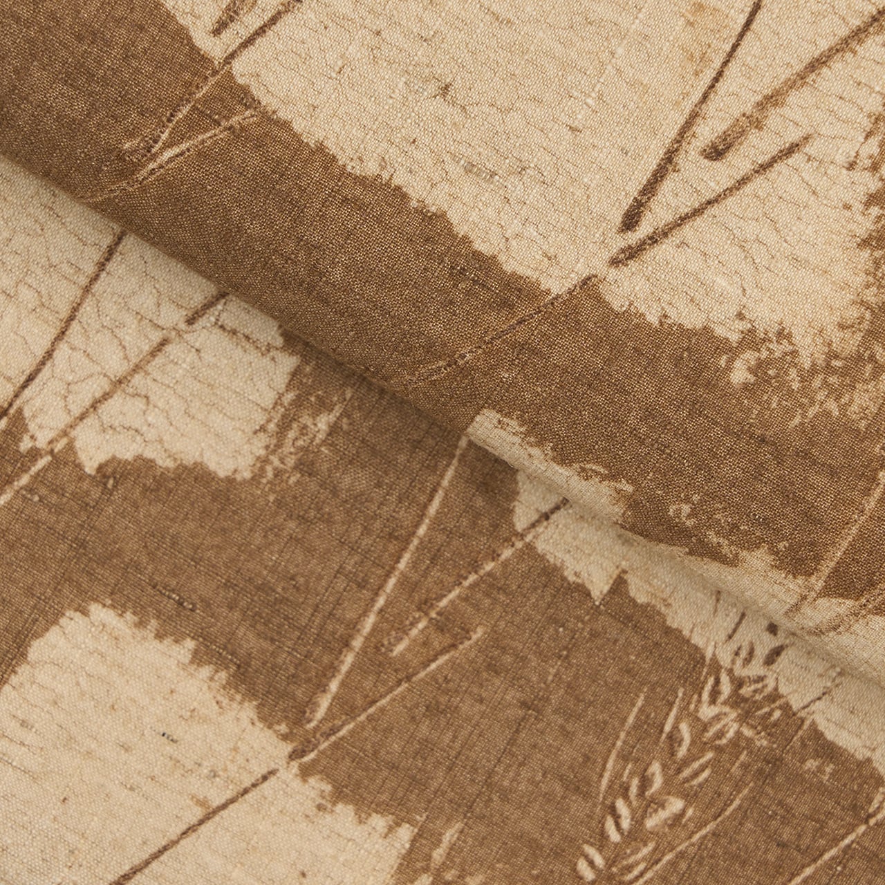 雲の模様の練色が、生地本来の色と思われる、さらっとしたあまり厚くない栗繭紬のような生地が黄色味のある薄茶・柴染色に染められ、流れるような雲が手描きの蝋纈染めで染め抜かれています。