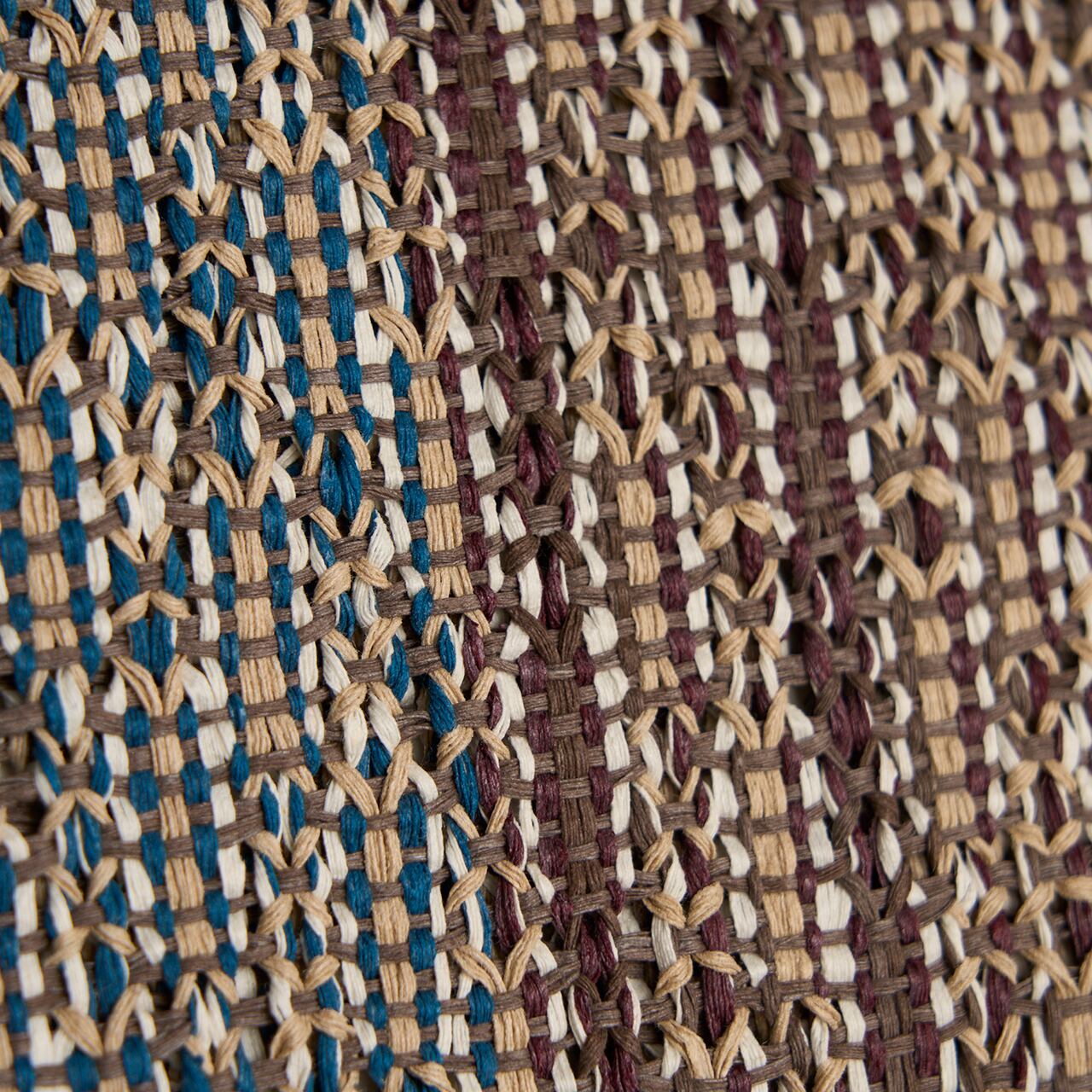 紙の糸だけでも、白橡色のベージュ、象牙色、鉄御納戸色の藍、黒橡色、黒鳶色などたくさんの色が使われていて、右の4分の1は茶系が主で、濃い茶色で3本の縞が織られ、左の4分の3には藍系の糸が織り込まれています。
