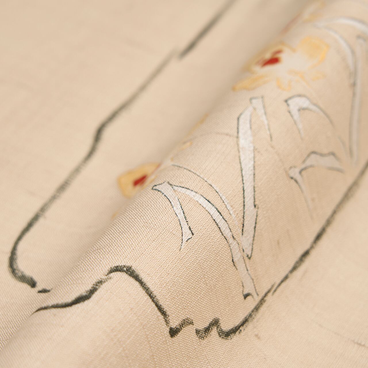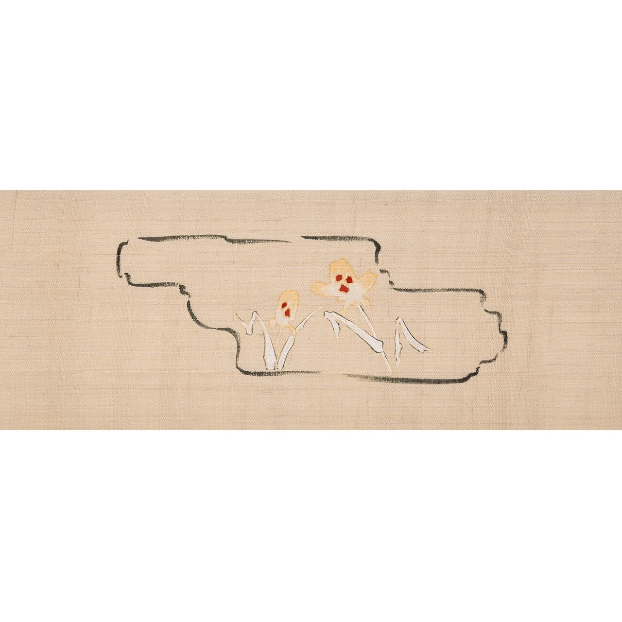 横に節のある、座繰りのサラッとしたあまり厚手ではない紬の生地が淡いクリーム色・練色に染められ、お太鼓に濃いグレー・檳榔子染色の枠が取られた中に、野に咲く小さなお花が手描きされた、素朴な雰囲気の模様に、お花に色付けされた赤い色がアクセントになった、素敵な九寸名古屋帯です。