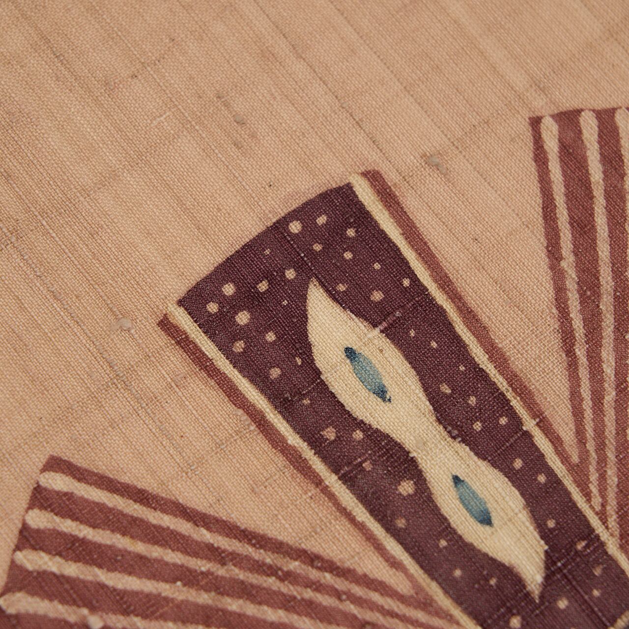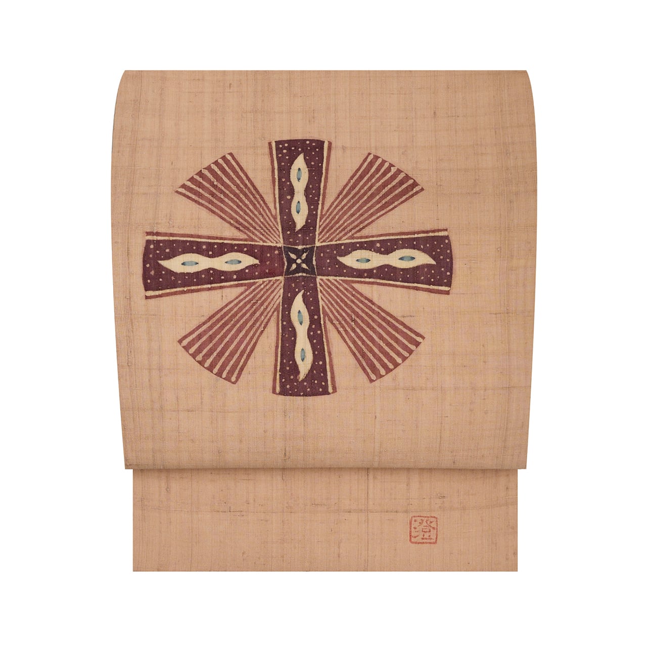 横に節のある座繰りのサラッとした生紬の生地が、少し赤味のあるベージュ・梅染色に染められて、お太鼓には十字の模様に斜めに房のようなものが付いた、お花のような幾何学模様が手描きの蝋纈染で描かれた、お洒落な九寸名古屋帯です。