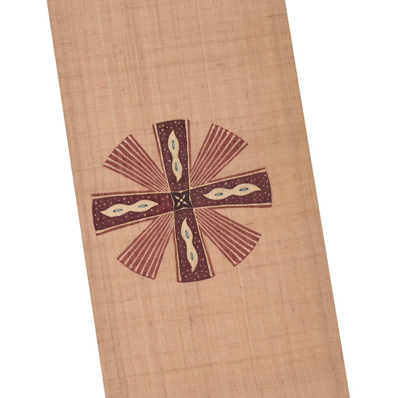 全体的には同系色でまとめられていて、少し透明感のある地色に、それと同系色の濃いクロスの模様がくっきりと描かれ、そこについた一段淡い蘇芳香色の房のような模様はお花の雄しべのようにも、クロスの後光のようにも見えて自然にアシストしているようで、バランスの良い素敵な模様となっています。