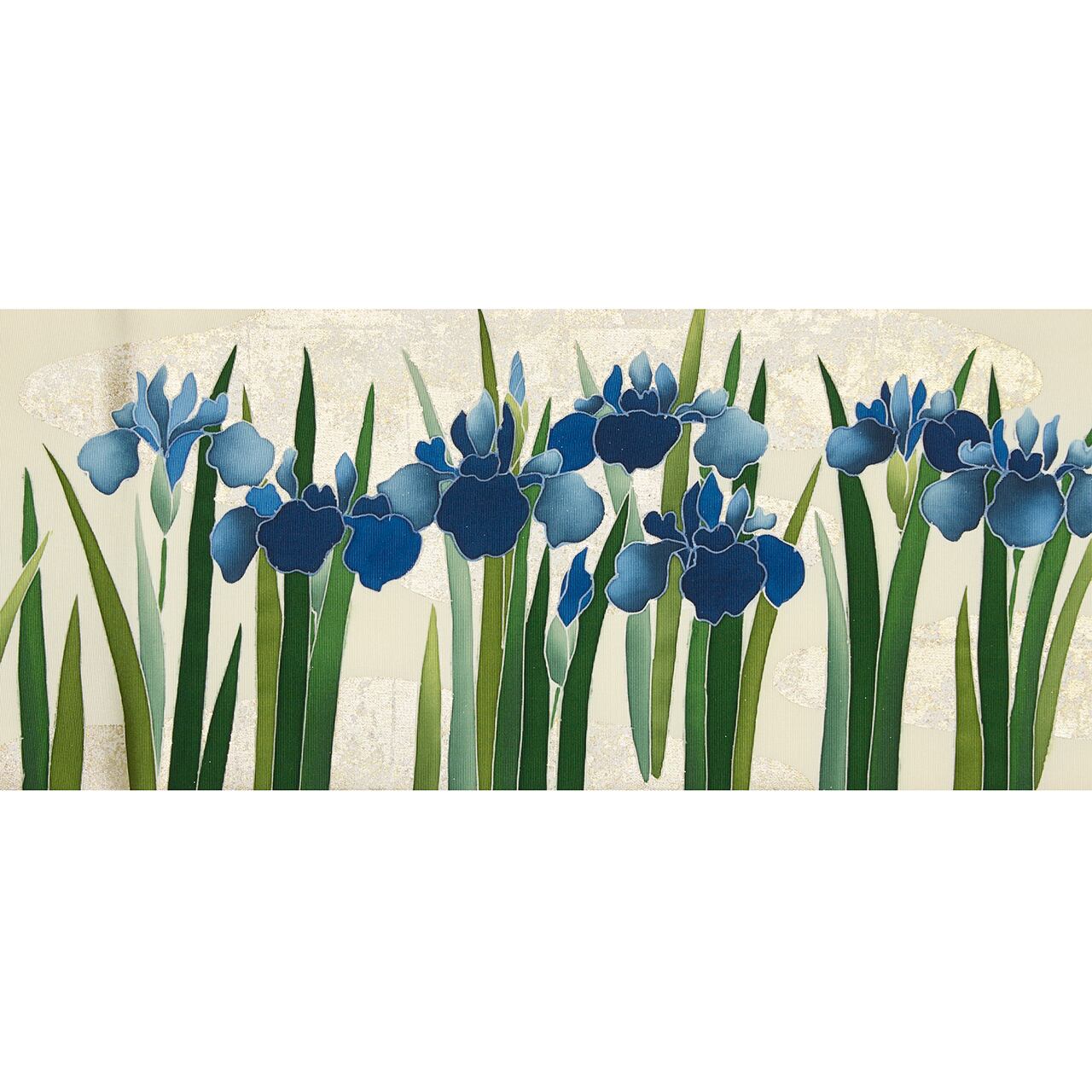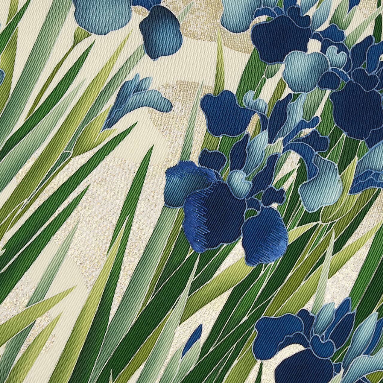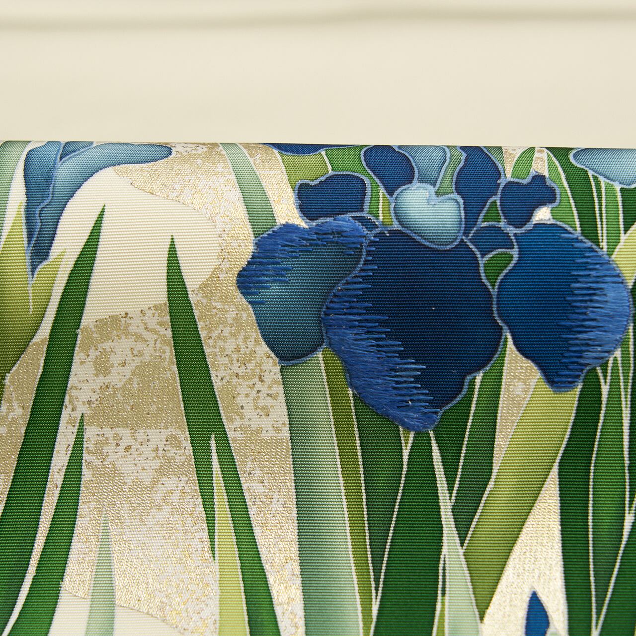 上質な河籐の塩瀬の生地がクリーミーな象牙色に染められ、お太鼓には摺り金の加工で流水の模様が染められ、そこに勢いよく葉を伸ばして咲く花菖蒲のお花が、写実的に手描きの友禅で描かれた九寸名古屋帯です。