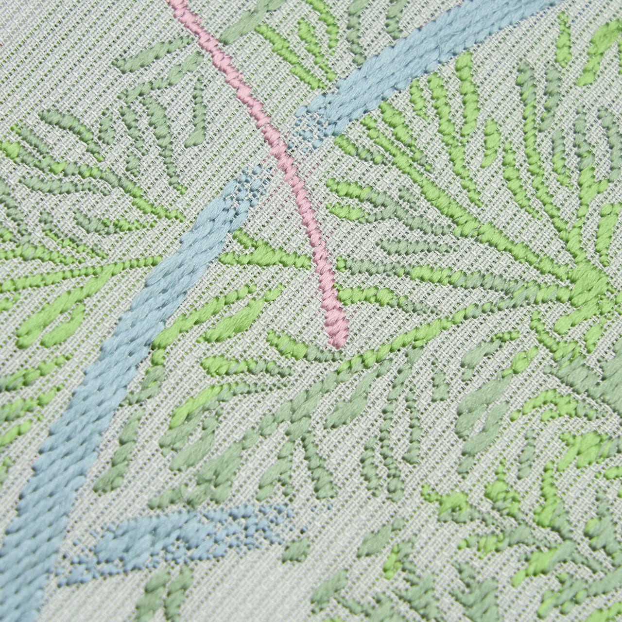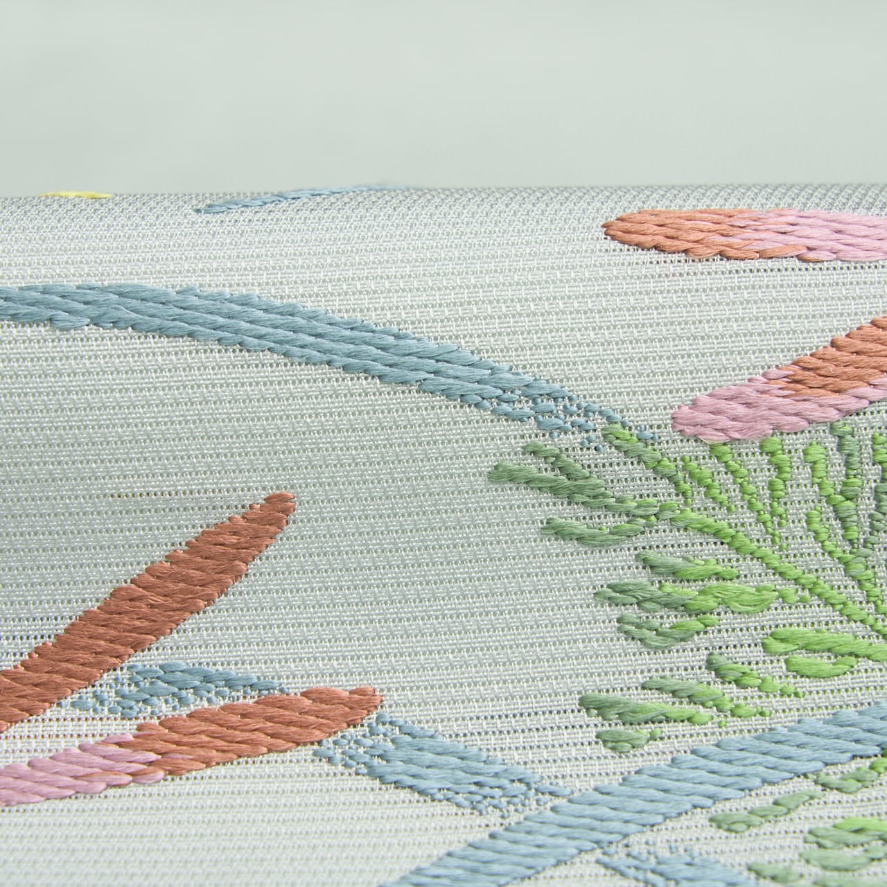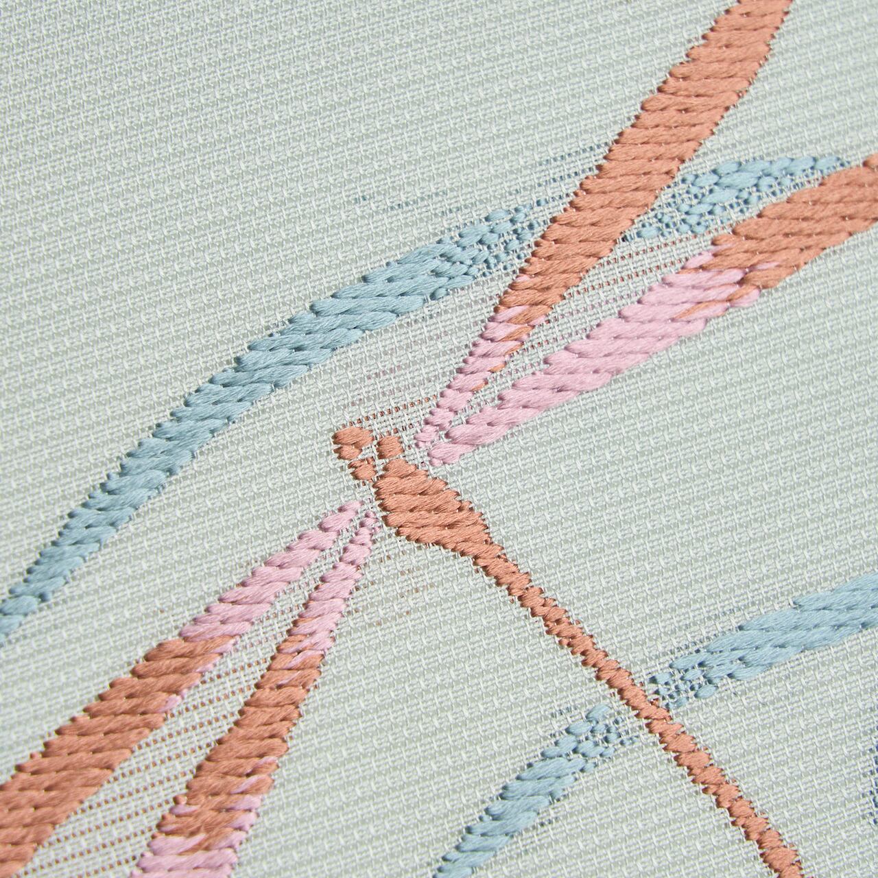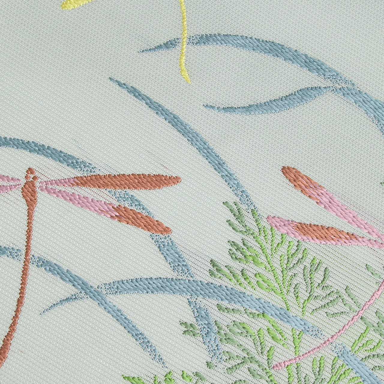 はじめに目にした時には、刺繍かと思ったほどボリューム感のある浮織で織られていて、トンボの羽には暈しも加えられていたりして、涼しげな色使いでありながら、しっかりとした存在感のある図案となっています。