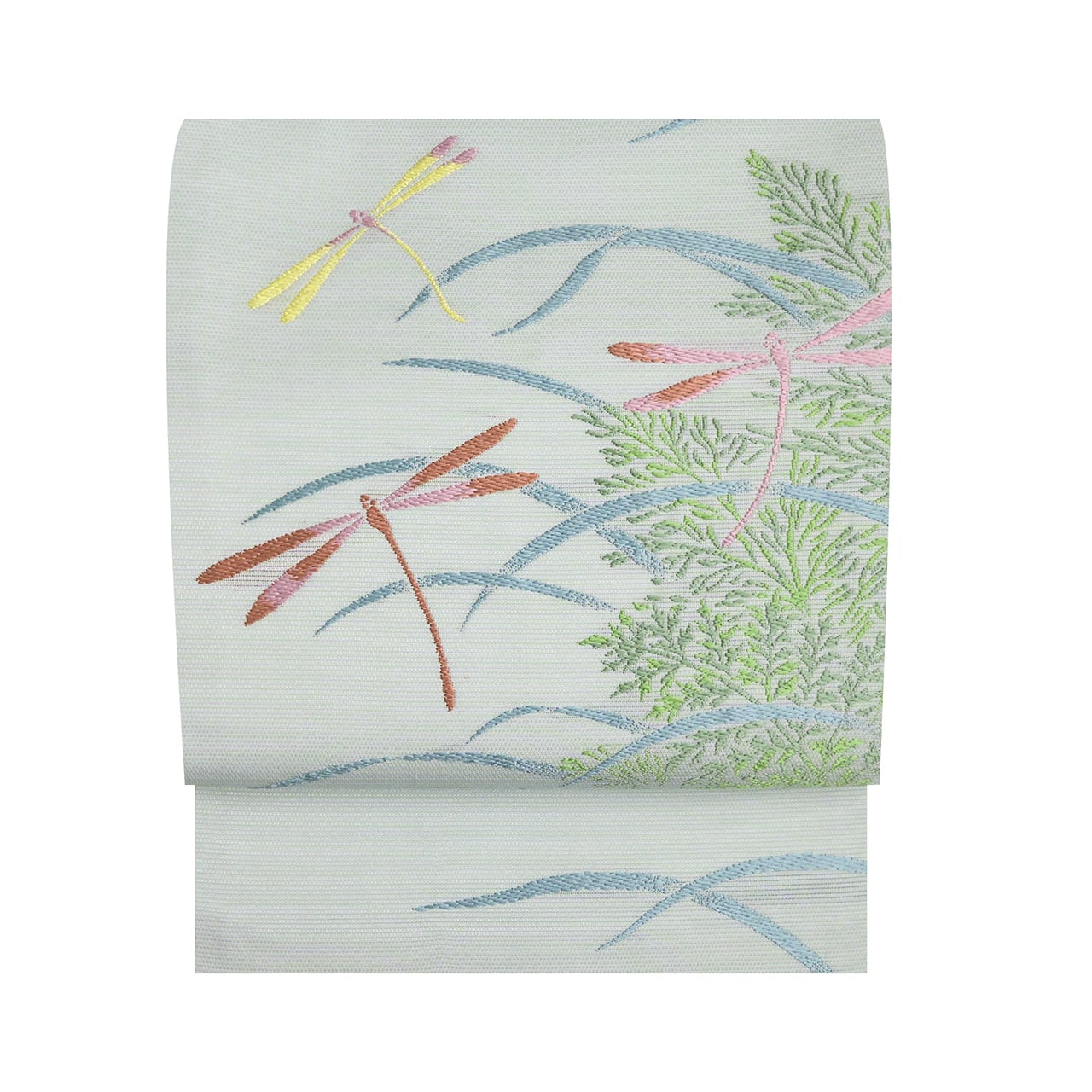 緑味のある淡い水色・青磁鼠色の絽織の紗の生地に、柳染色のよもぎのような草の葉と、錆浅葱色のススキの葉が風になびいているような様子が描かれ、そこに浅蘇芳色や女郎花色、石竹色などの綺麗な彩りのトンボが飛んでいる風景が、たっぷりとした浮織で描かれた、たつむらさんならではの個性の感じられる、素敵な夏の九寸名古屋帯です。