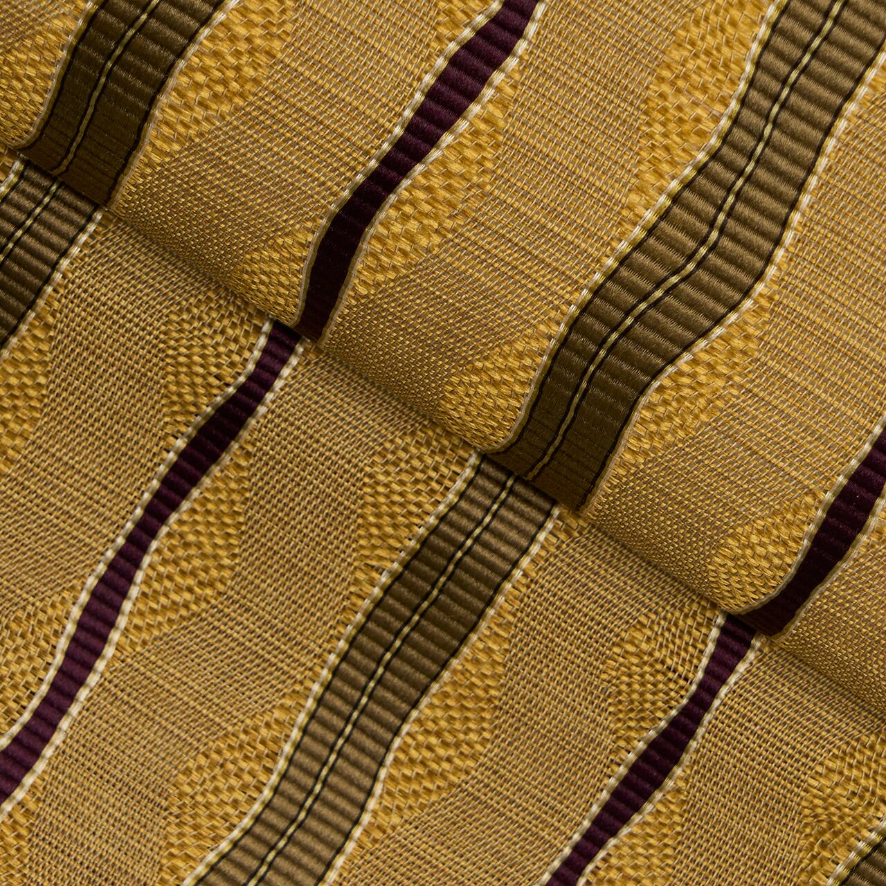 少し黄色味ある茶・朽葉色の紗のようなシャリっと織られた地に、渋みのあるモスグリーン・海松色と濃い臙脂色・葡萄色の真田織のよろけた縞が織り出された、とてもすっきりと潔いお洒落な雰囲気の、龍村製の両面全通の「日野間道」の本袋帯です。
