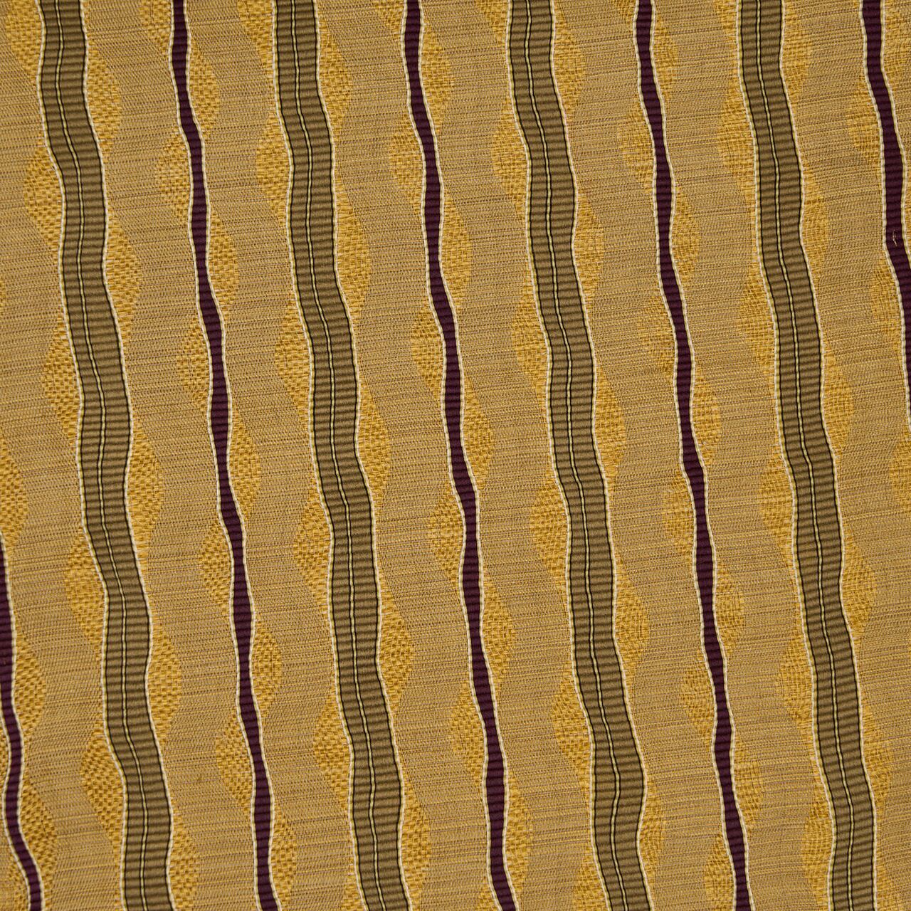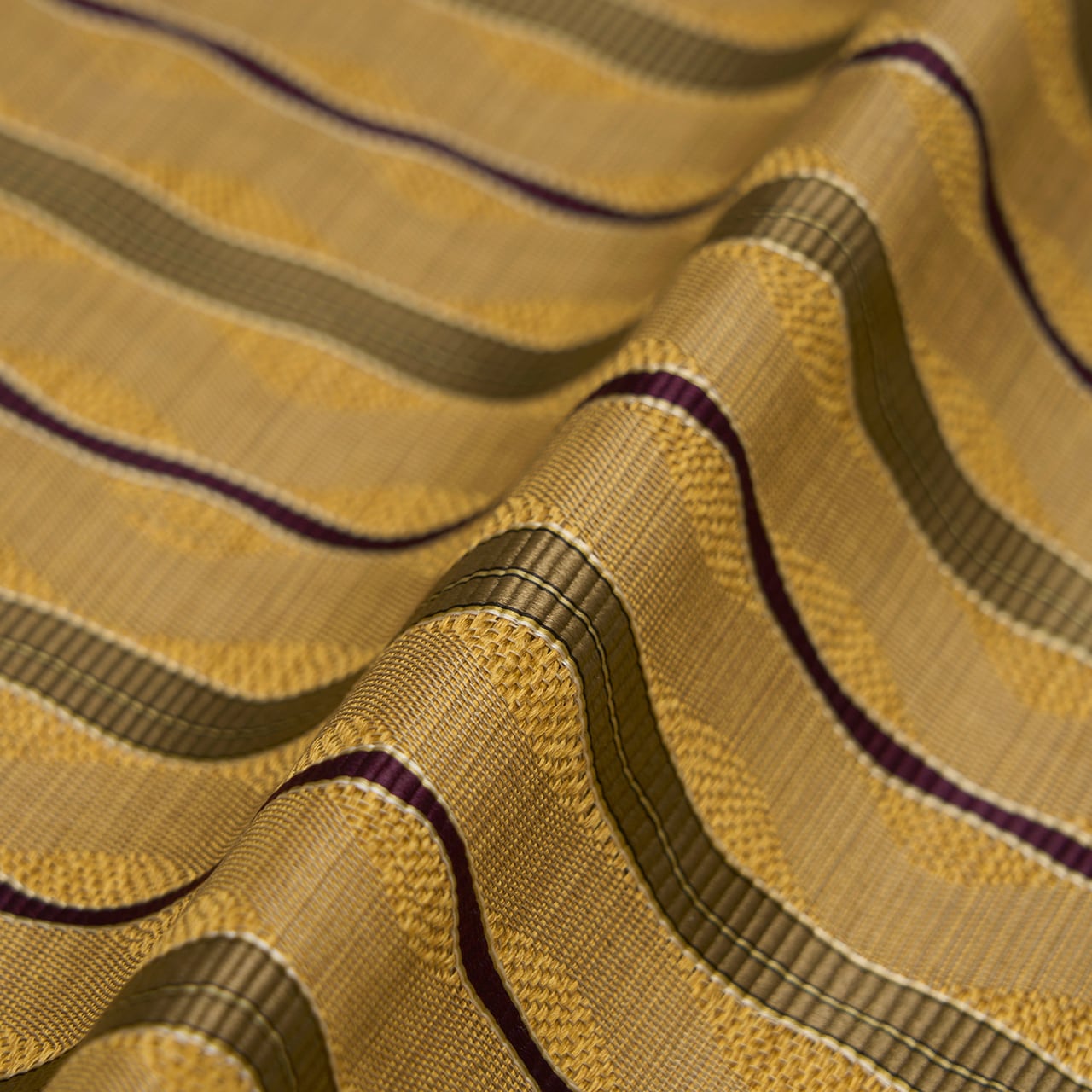 太めの海松色の縞と葡萄色の縞は、揺れるようなよろけの縞になっているのですが、その影のように、地と同色の糸で、揺れが反対になるような模様が縦の浮き織で添えられているのも、真田織の縞が際立つように浮き上がって見えるために効果的に配置されているようです。