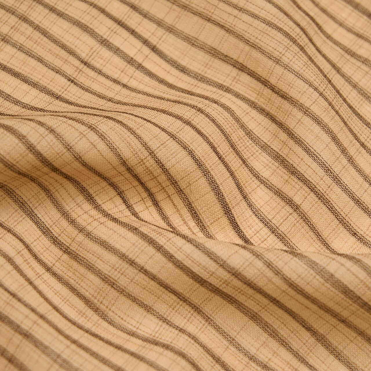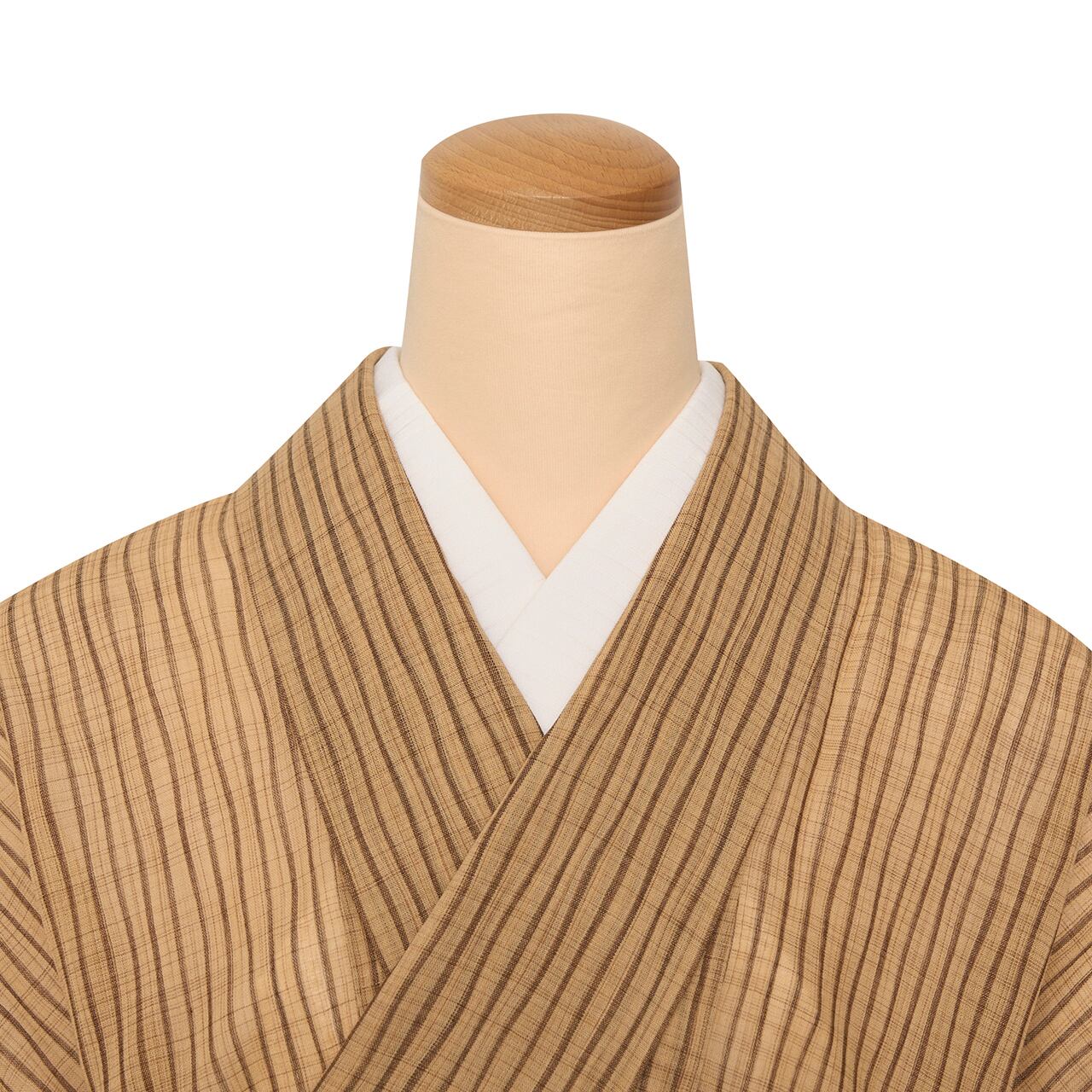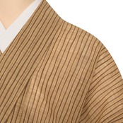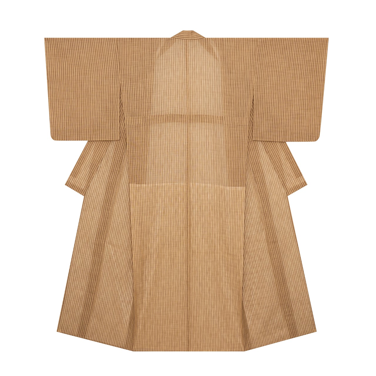 柿渋で染められた細い糸で、丁字染の地に、濃い焦げ茶・涅色の細い縞がよろけるようにうねうねと織り出された、少し透け感のあるシャリっとした質感の紬紗のような、とてもお洒落な雰囲気の単衣のお着物です。