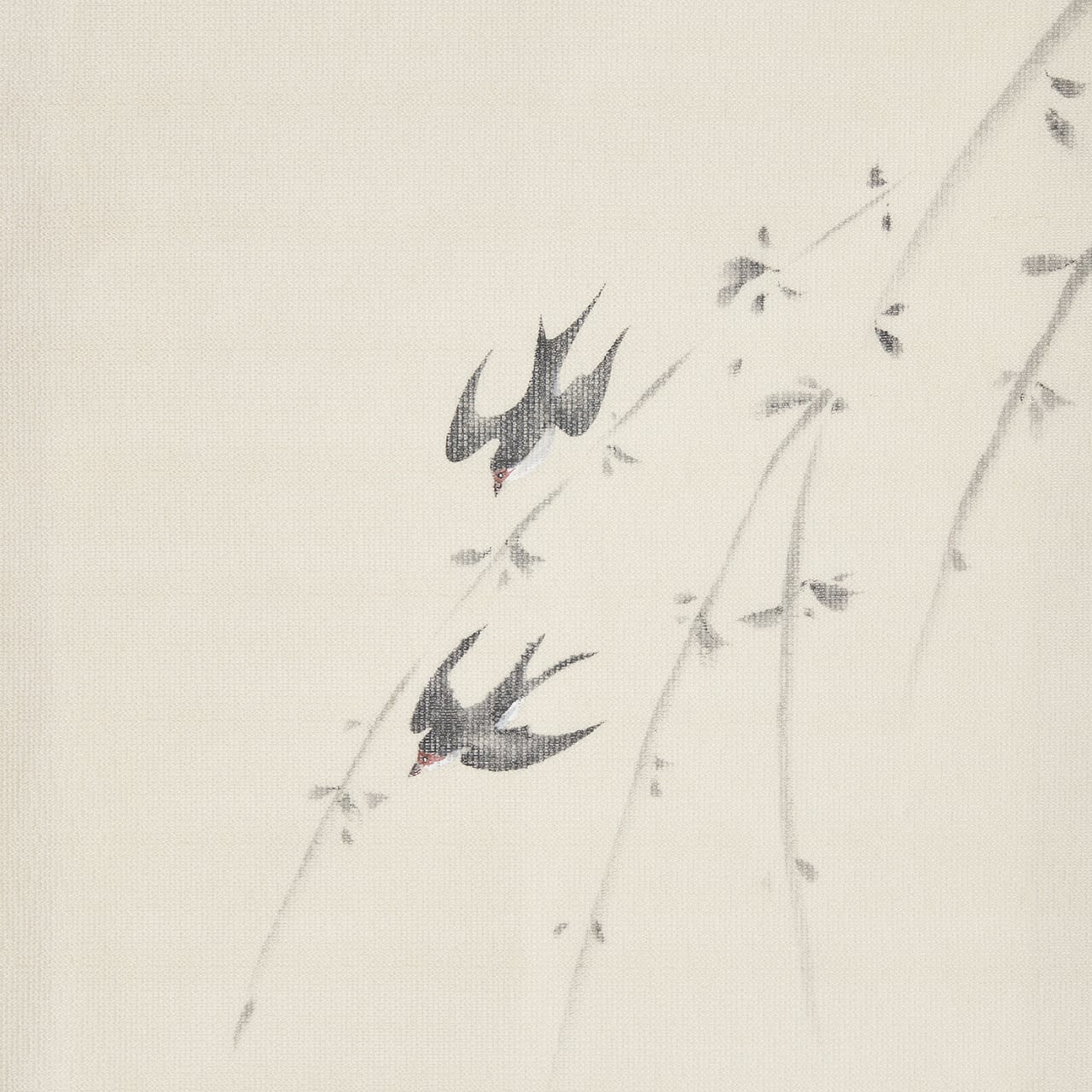 風になびく柳の枝の涼しげな雰囲気と、躍動感のあるツバメの姿が本当に清々しく目に映る、とてもお洒落な大変おすすめの一点です。