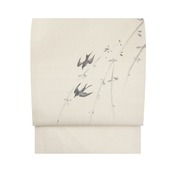 超極細の銀駒の糸が織り込まれた、菱の地紋のあるシャリっとした紋紗の生地のお太鼓に、枝垂れる柳の枝と、そこに飛び交う2羽のツバメの姿が墨色で手描きされた、清涼感のある素敵な九寸名古屋帯です。