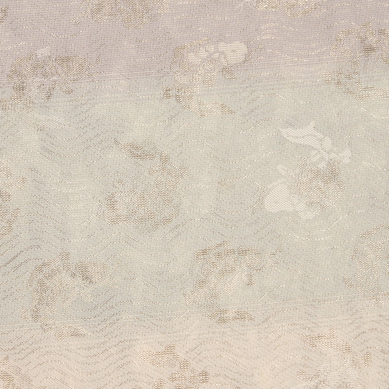 白汚しの淡いグレー・白鼠色の地に、やはりとても淡い薄紫・薄色と、淡い青磁色・青白橡色の段が暈しで取られ、中型よりやや小さめに、波の上を翻って泳ぐ鯉の姿、いわゆる名物裂文様のひとつでもある荒磯文様が銀の糸で織り出された、とてもお洒落で清涼感のある夏の袋帯です。