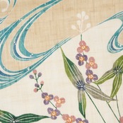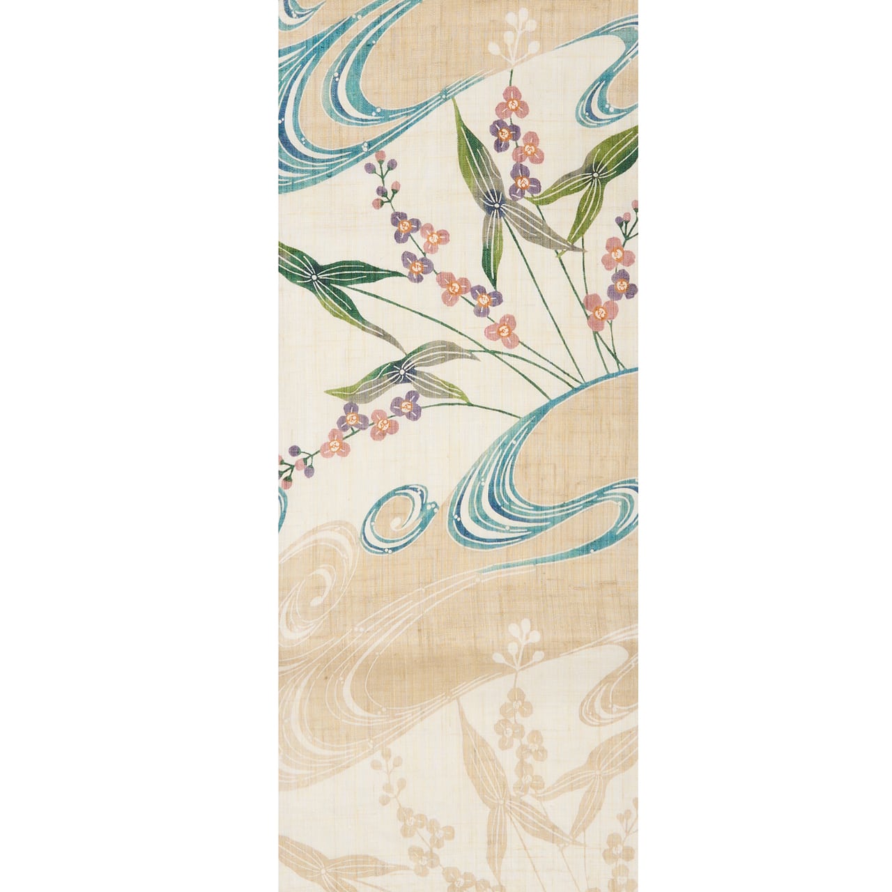 経緯に少し節のある大麻の麻の生成り色の地に、お太鼓には大きく弧を描いて流れる水が表され、それを境にして上下は砂色のベージュで染め分けられ、水の輪の間には可憐なお花を咲かせるオモダカが描かれた、清涼感のある素敵な夏の九寸名古屋帯です。