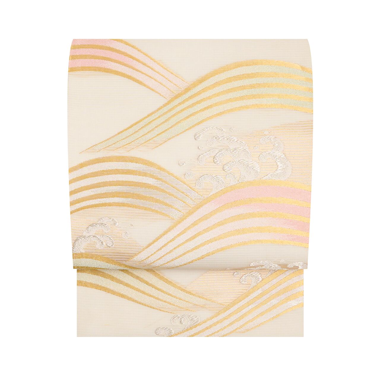 象牙色のシャリっとした質感の紗の生地が絽織にされ、そこに大きくうねる波が左右から押し寄せるように極細の金駒糸で織られ、その波の金の線の間は淡いピンク・虹色、淡い薄緑・夏虫色、生成り色の白などの糸で暈しを交えながらうめられて、綺麗な形の波頭はやはり極細の銀駒糸と生成り色の糸で躍動感たっぷりに織り出された、とてもゆったりとした豊かさのある美しい夏の本袋帯です。