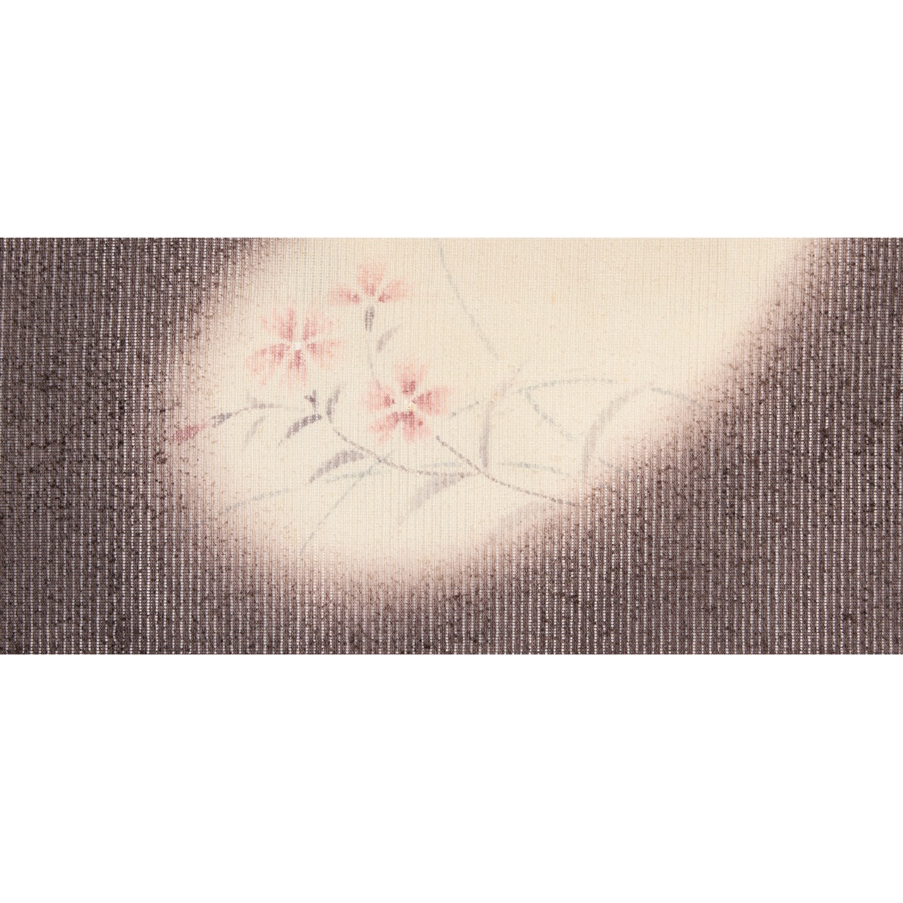 少しネップのような粒のような節の見られる薄手の紬地が絽織りにされたものが、少し赤味のあるこげ茶・檳榔子染色に染められ、お太鼓に大きな丸の形が象牙色に暈しで染め抜かれ、その中には川岸で咲いているようなナデシコのお花が手描きされた、楚々とした雰囲気の涼しげな夏の九寸名古屋帯です。