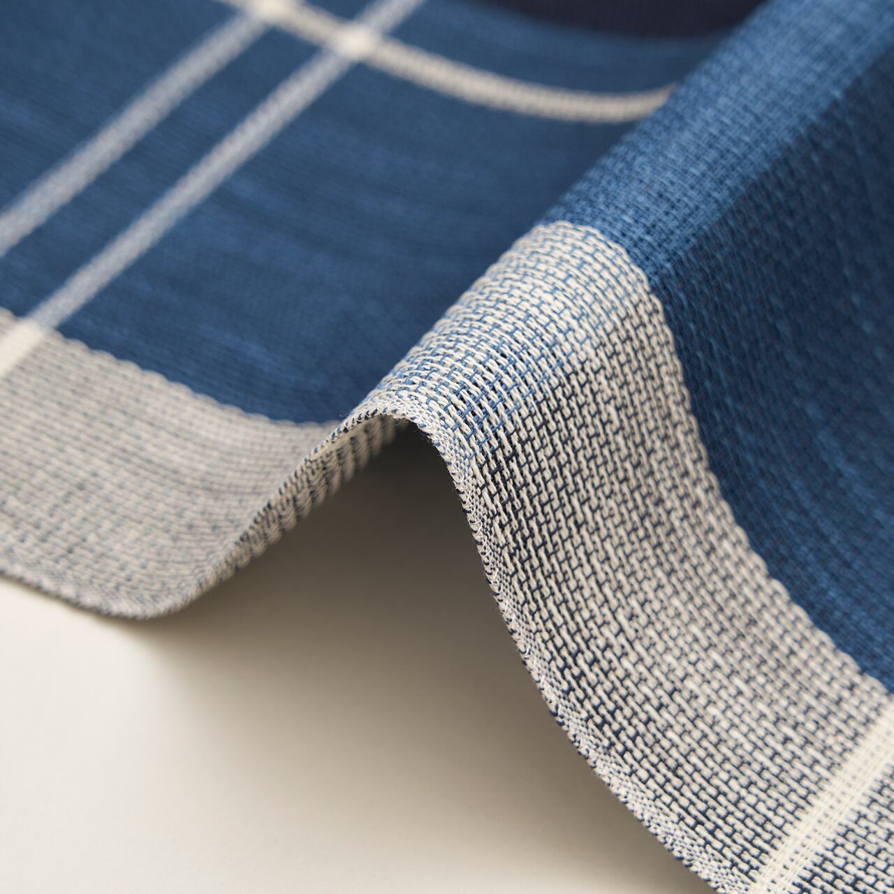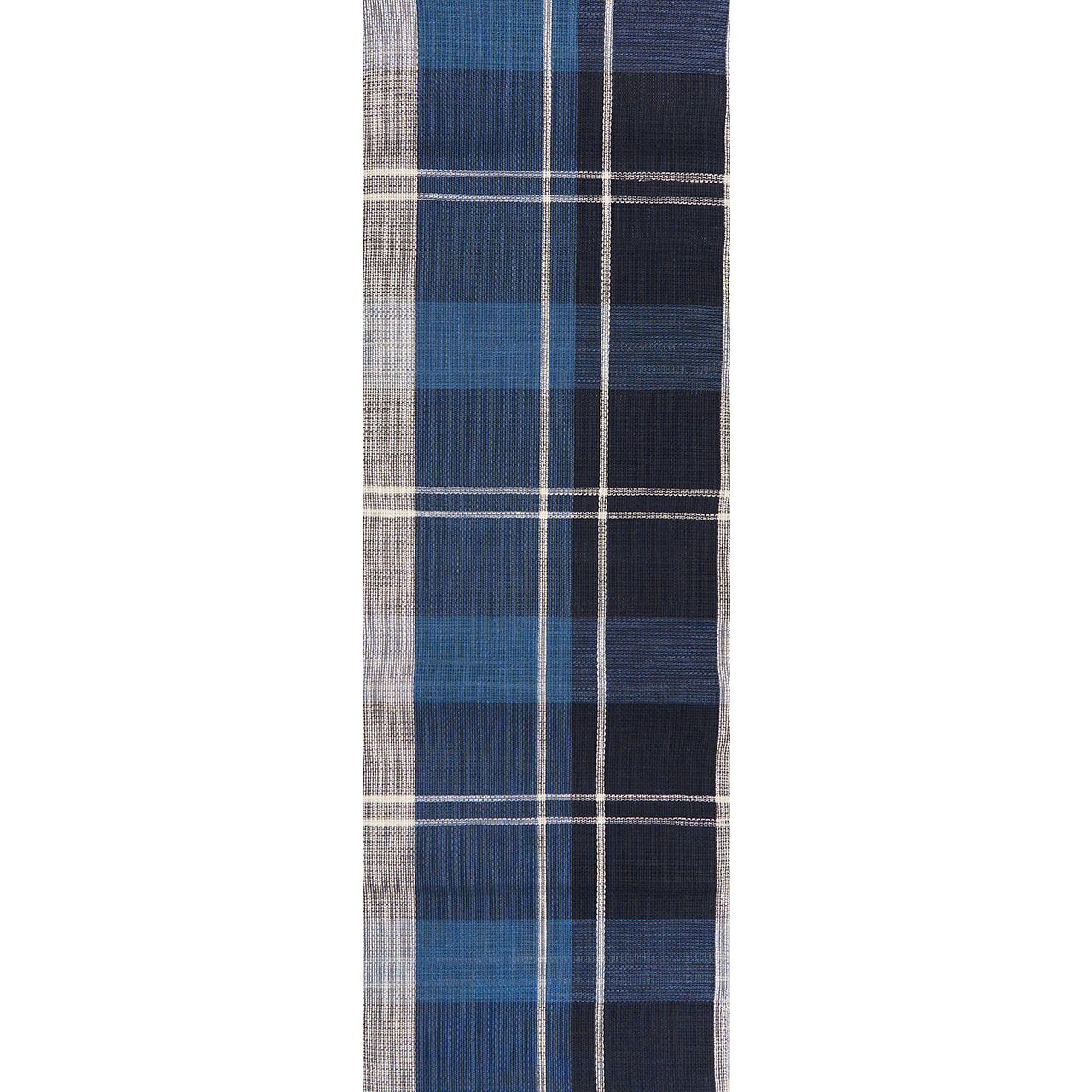 生成り色の白から濃い藍色までの濃淡のある糸が経緯に交差して、5段階の藍の色が大きな格子の模様を構成した、とてもすっきりとした佇まいのお洒落な夏の八寸名古屋帯です。
