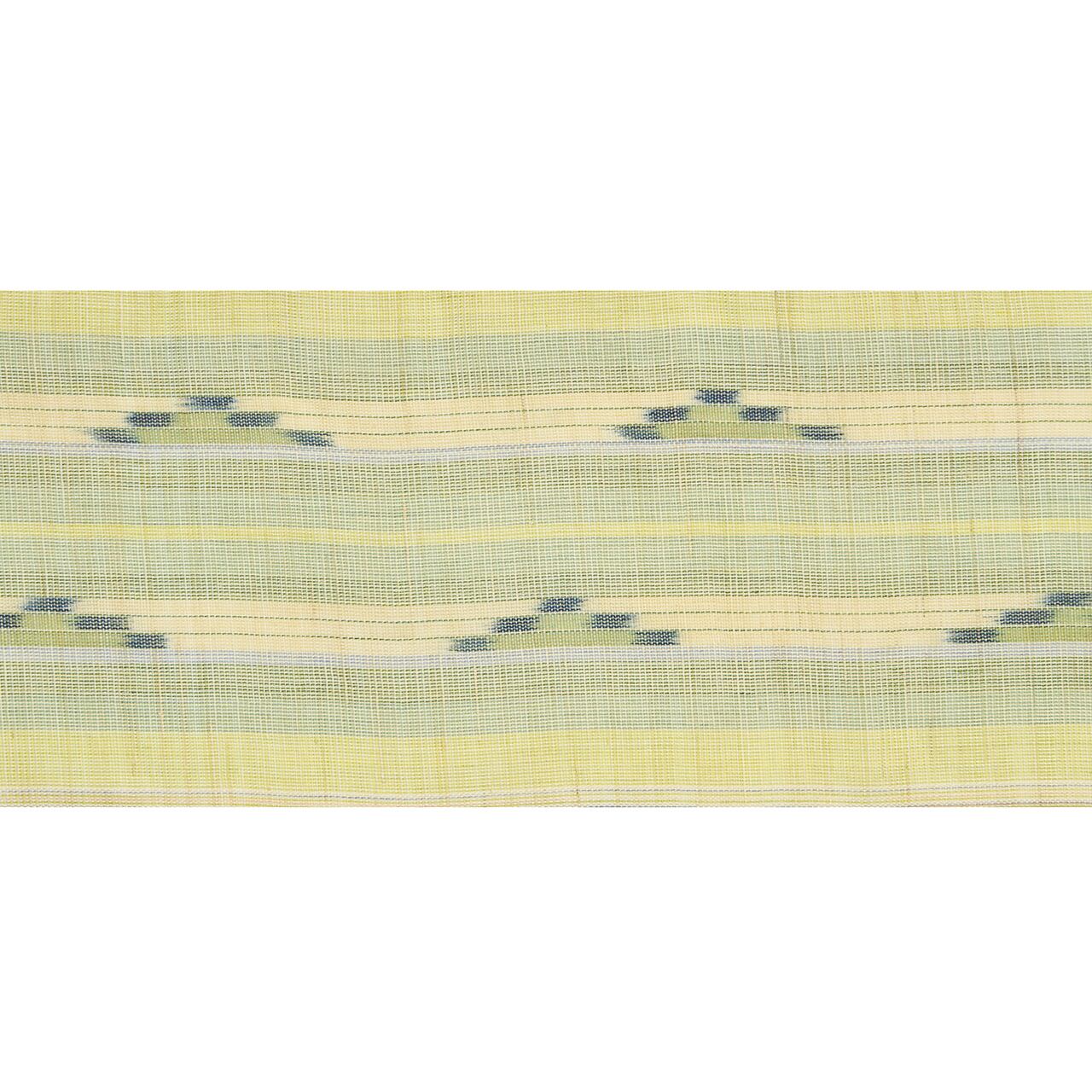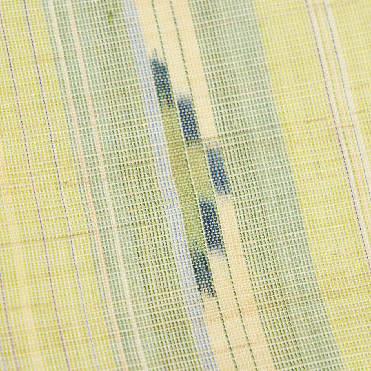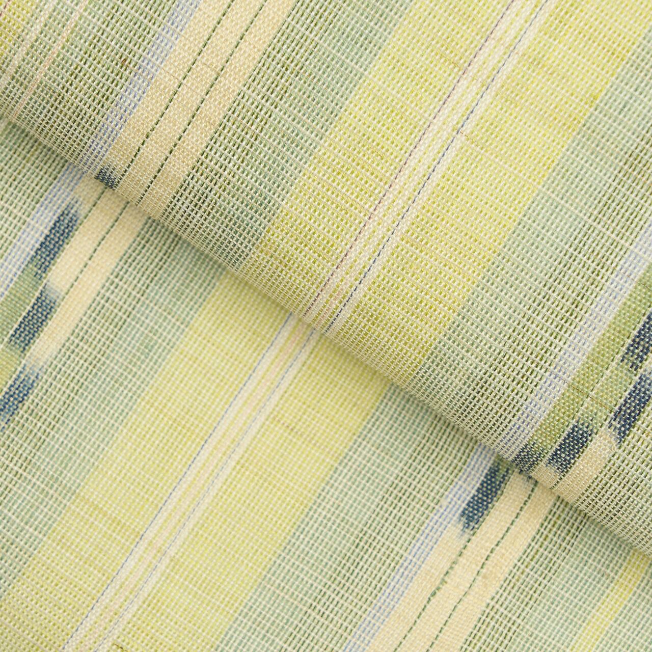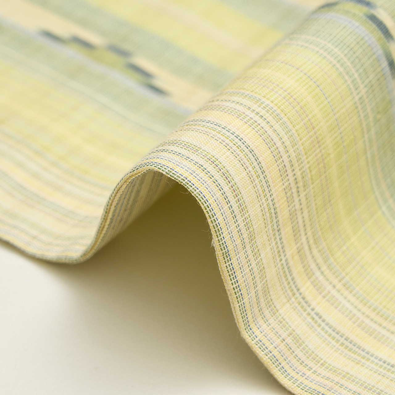 象牙色の地に、縦の縞の模様は、夏虫色の明るい草色を中心に、水浅葱色の糸が織り込まれたものや、練色や浅紫色など5、6色の糸で複雑な色合いを出しながら、綺麗な模様を織り成しています。