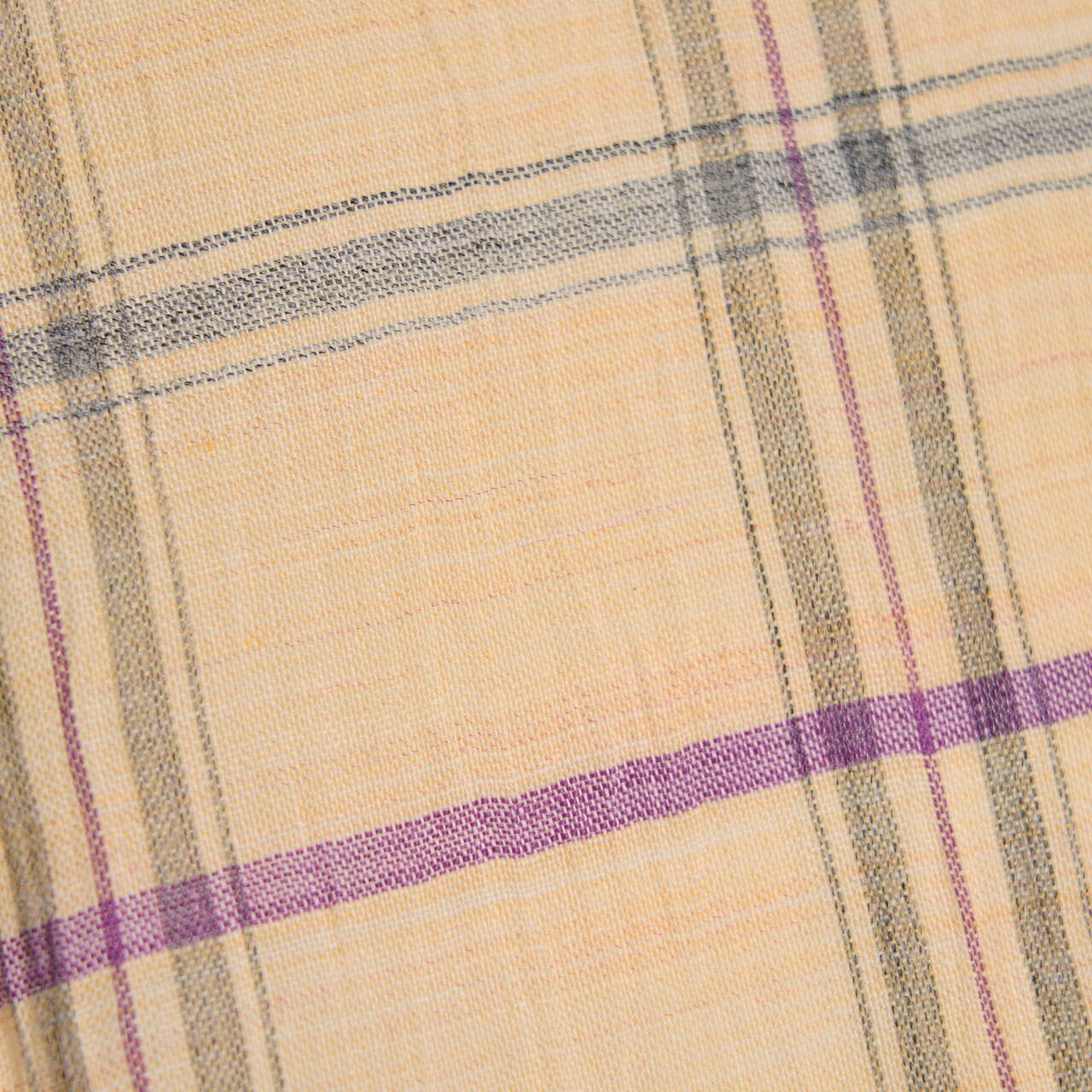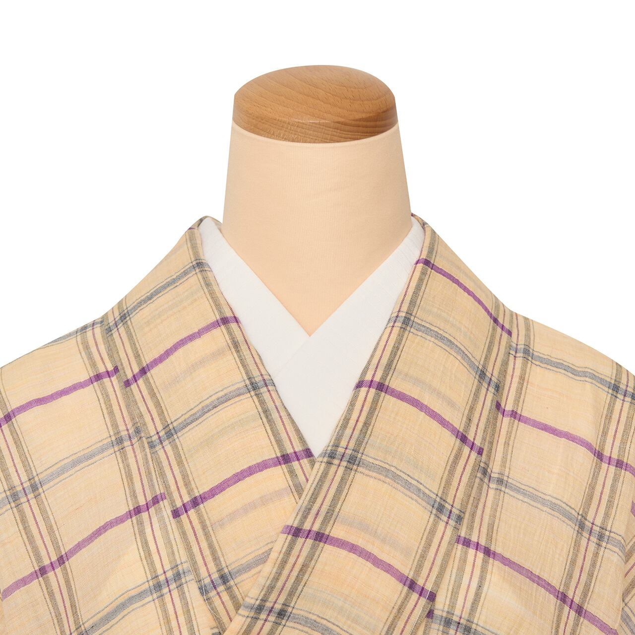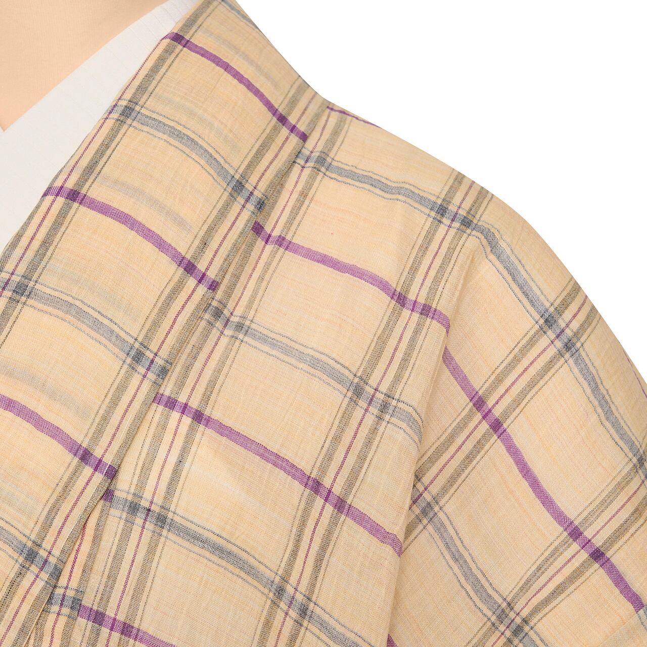 こちらは、オレンジ味の感じられる明るいベージュ・薄卵色の独特のシボのあるサラッとした生地に、横には明るい紫・京紫色と藍味のある淡いグレー・桔梗鼠色の子持ち縞が織られ、縦にはグレー味のあるこげ茶・黒橡色の縞に、中心には細い京紫色の線が1本入れられた縞が織られ、それが交差してお洒落な格子の模様を構成した、とても素敵な小千谷ちぢみの麻のお着物です。
