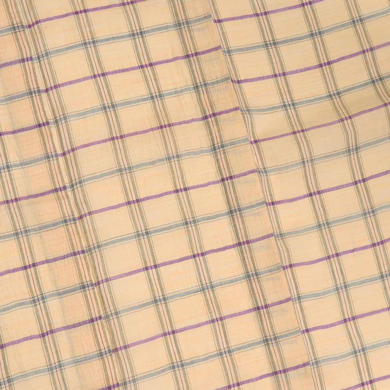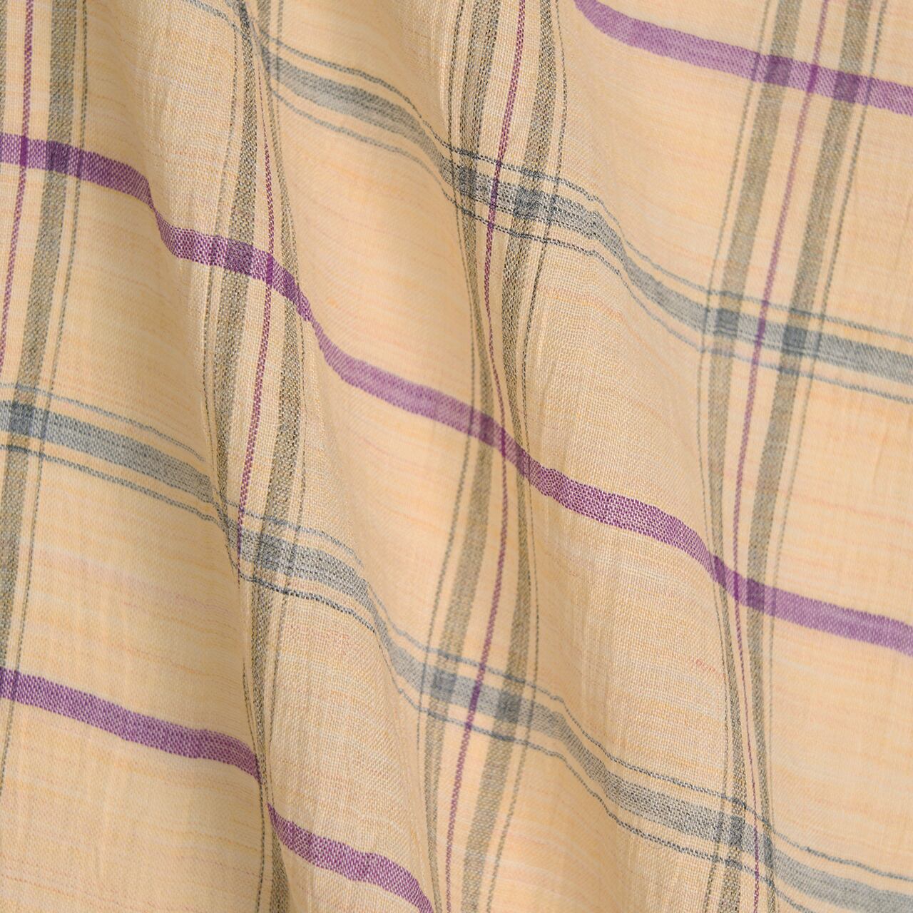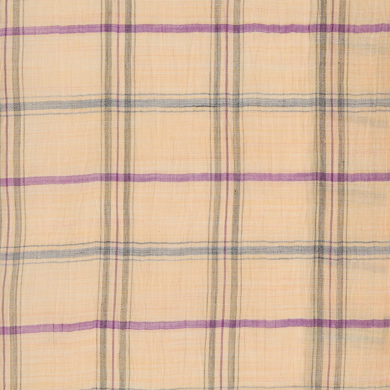 こちらは、オレンジ味の感じられる明るいベージュ・薄卵色の独特のシボのあるサラッとした生地に、横には明るい紫・京紫色と藍味のある淡いグレー・桔梗鼠色の子持ち縞が織られ、縦にはグレー味のあるこげ茶・黒橡色の縞に、中心には細い京紫色の線が1本入れられた縞が織られ、それが交差してお洒落な格子の模様を構成した、とても素敵な小千谷ちぢみの麻のお着物です。