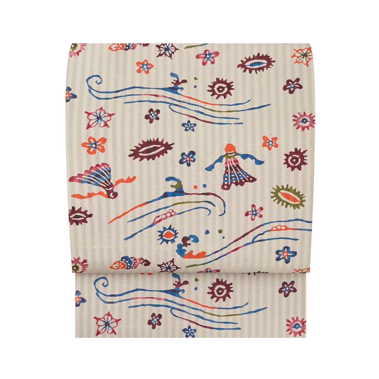 淡いグレー・灰黄緑色の紬紗のような生地に藍青色の縞が織られ、その部分が少し透かし織のようになった軽やかな生地に、サーフィンができそうな波が押し寄せていて、カラフルな巻貝やヒオウギ貝のようなものや、アワビのような貝、ヒトデやフジツボなどにお花も添えられた楽しい雰囲気の模様が型絵染で描かれた、夏の九寸名古屋帯です。