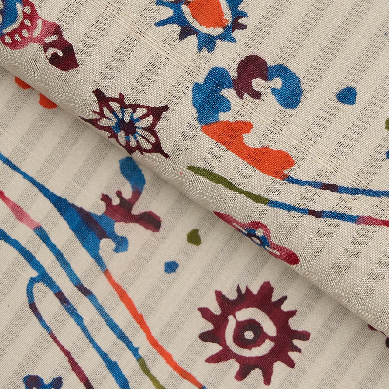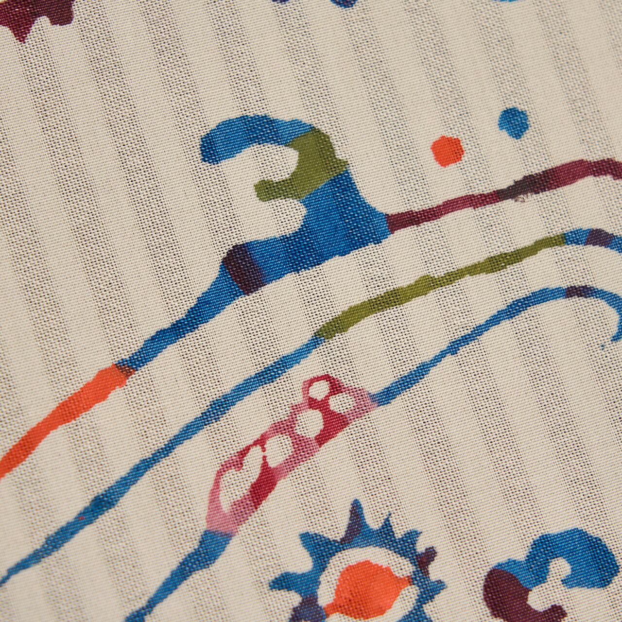 型絵染ならではユーモラスなデザインですが、顔料の使われ方も少しユニークで、比較的渋めの緑色や葡萄色、藍色が主流となって染められている中、ところどころに入れられた丹色のオレンジがとても効果的に模様全体を引き締めていて、元気の良いイメージにしているように見えます。