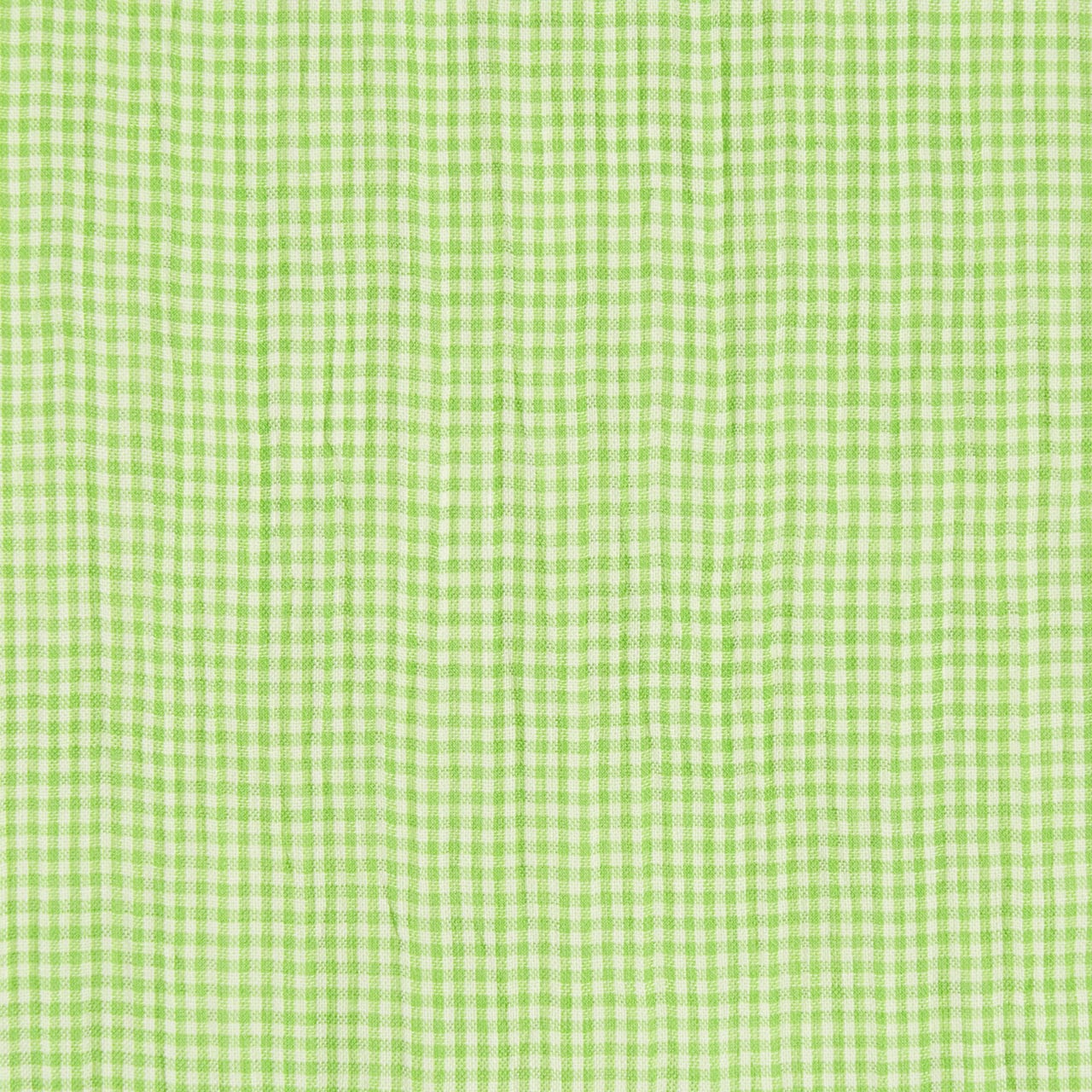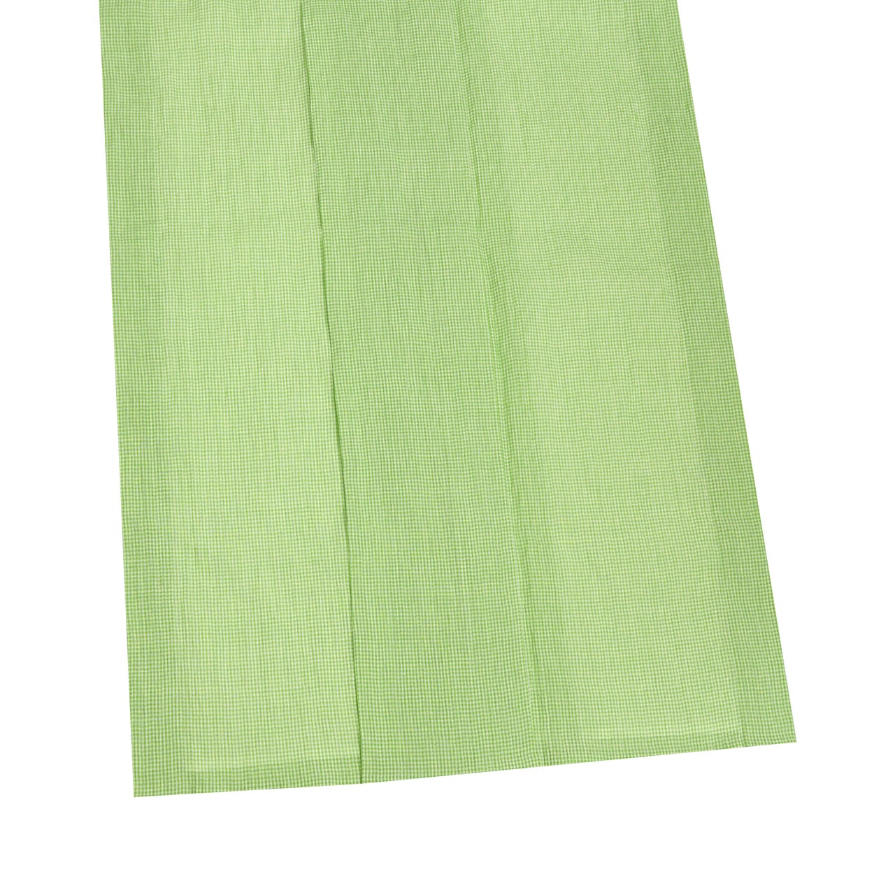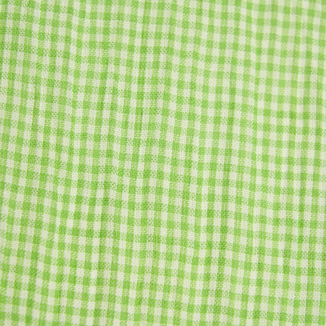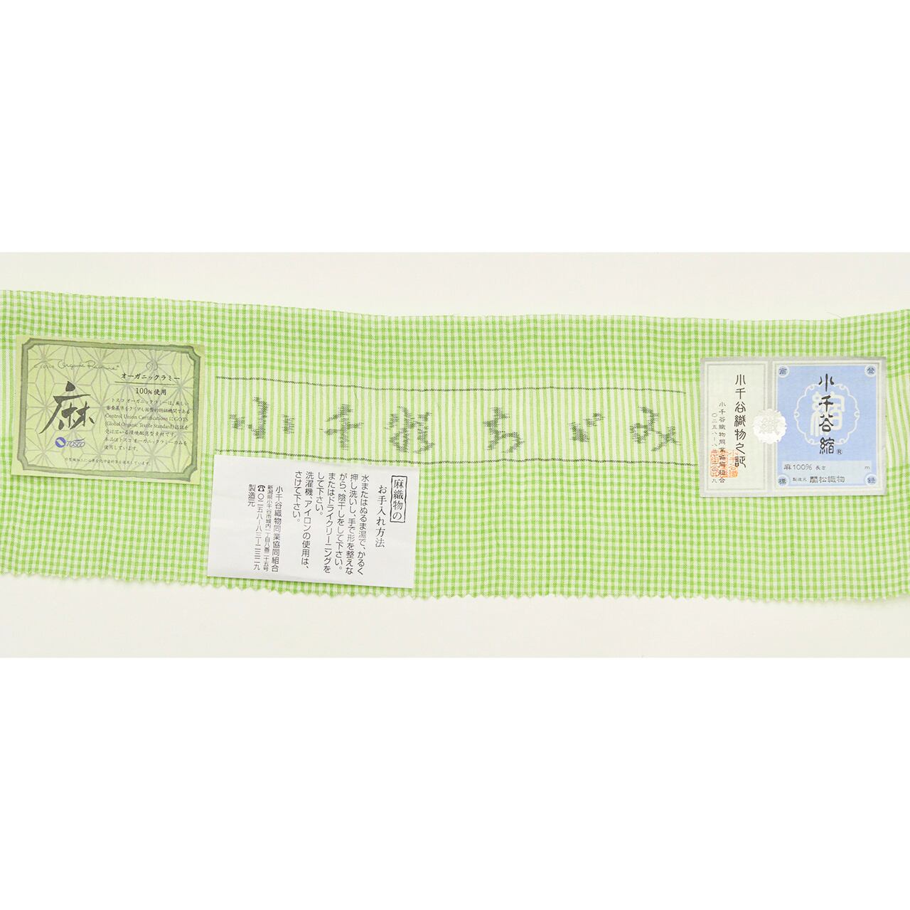 小千谷ちぢみならではのシボのある生成り色の生地に、フレッシュな若草色・淡萌黄色のみじん格子が織り出された、とても素敵なお着物です。