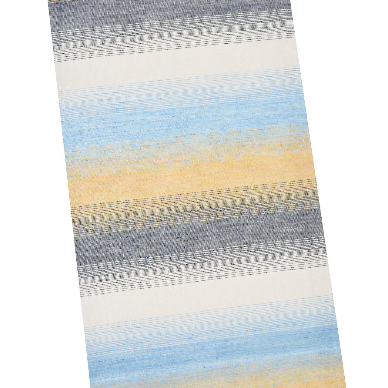 小千谷で織られたと思われる、サラッとした手触りの良い麻の生地が、生成り色をベースに、淡い藍・浅縹色や濃い藍・錆鼠色、そしてオレンジ味のある黄色・蜂蜜色などで段々に織られ、その境目の暈しも綺麗な、お洒落な雰囲気の全通の夏の九寸名古屋帯です。