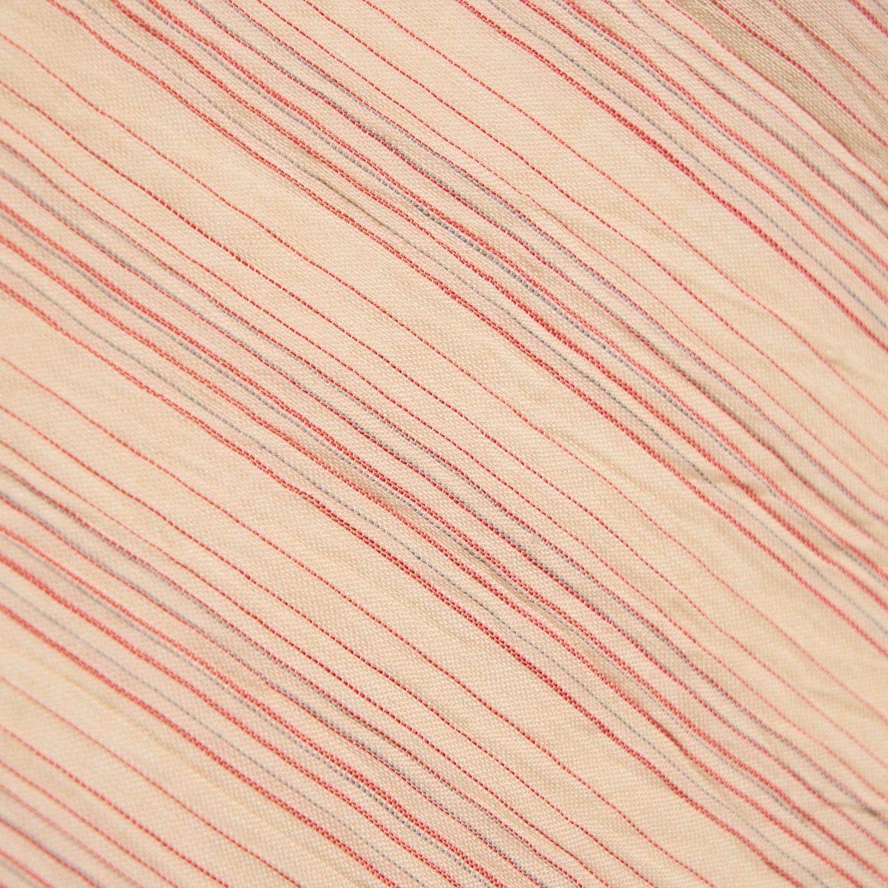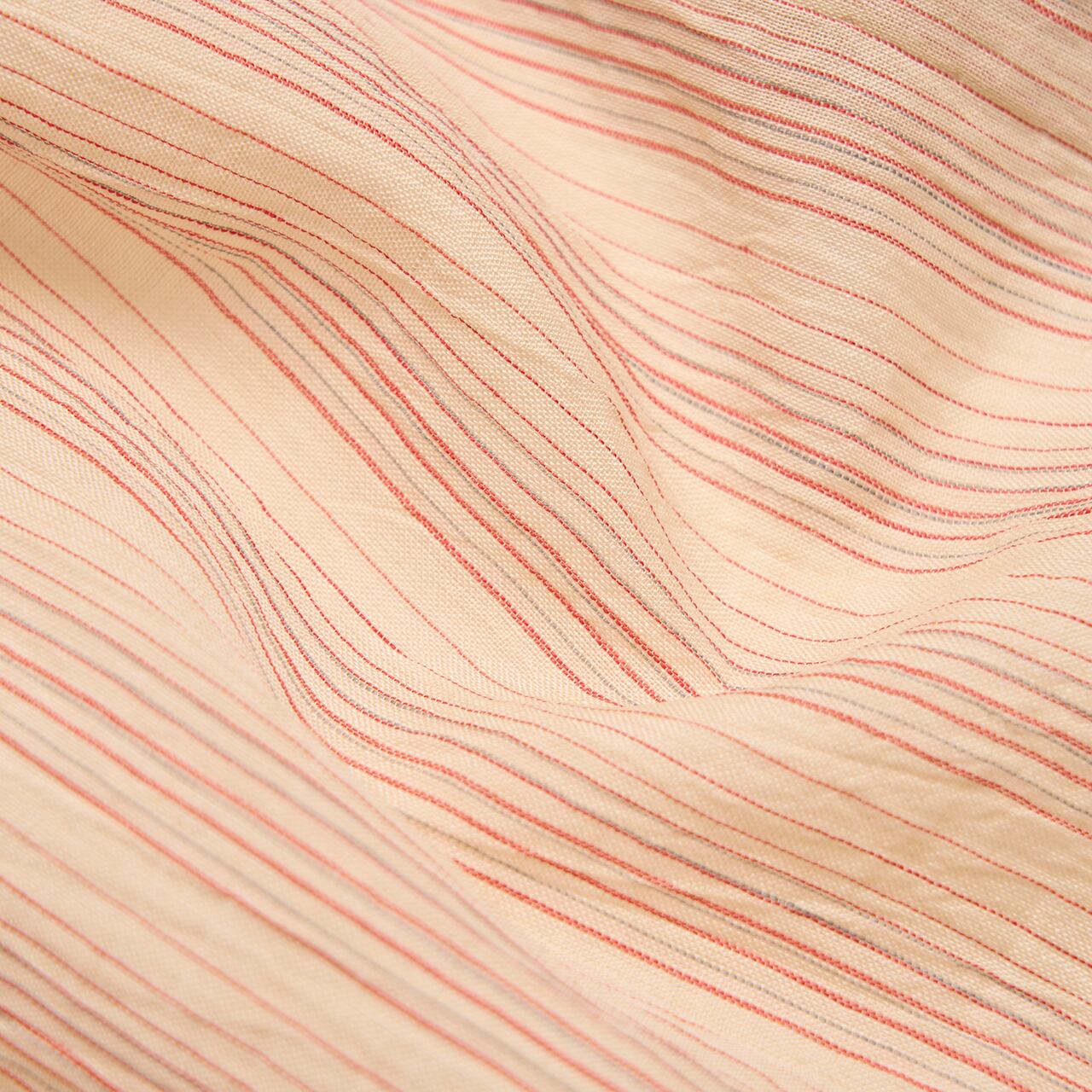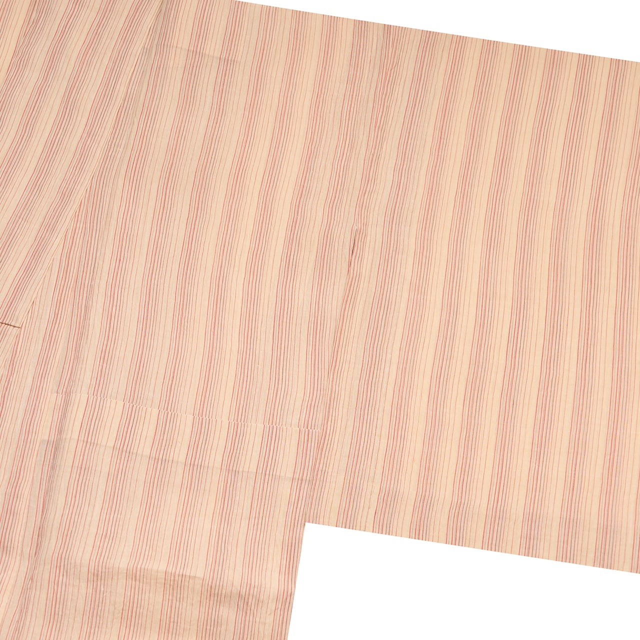 少しだけピンク味のある明るいベージュ・洗柿色の地に、10本ずつがひとつのグループになったような、細い縞の束がニュアンスの違う淡い赤系の色・浅蘇芳色と、蘇芳香色、藍鼠色の3色で太く細く織り出された、変り縞模様の小千谷ちぢみのお着物です。