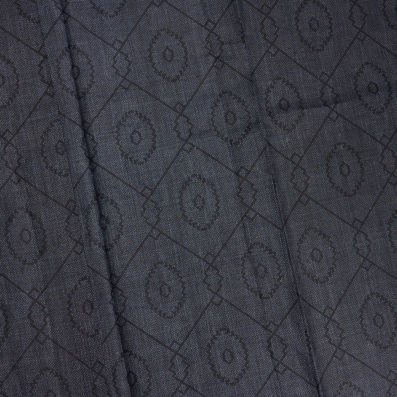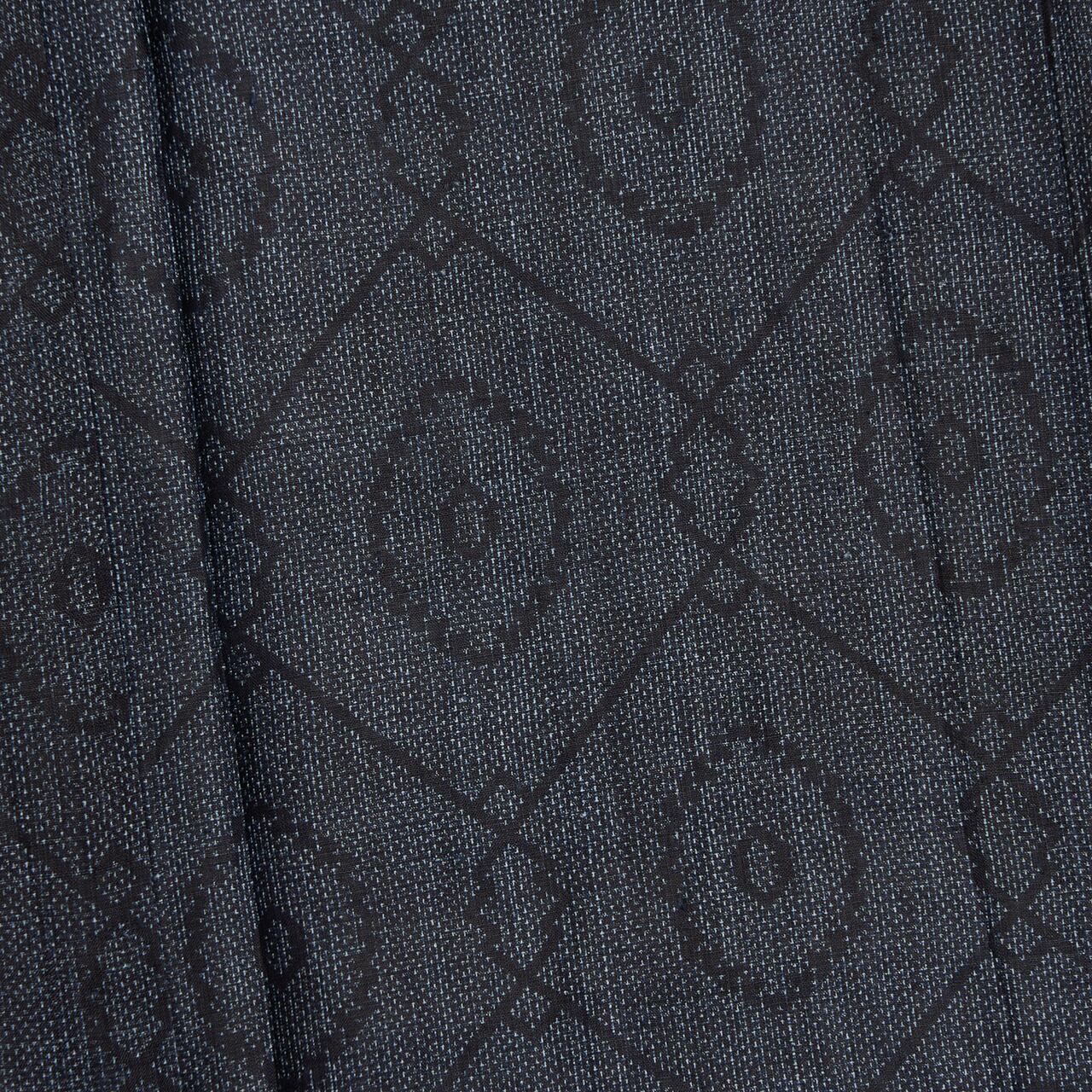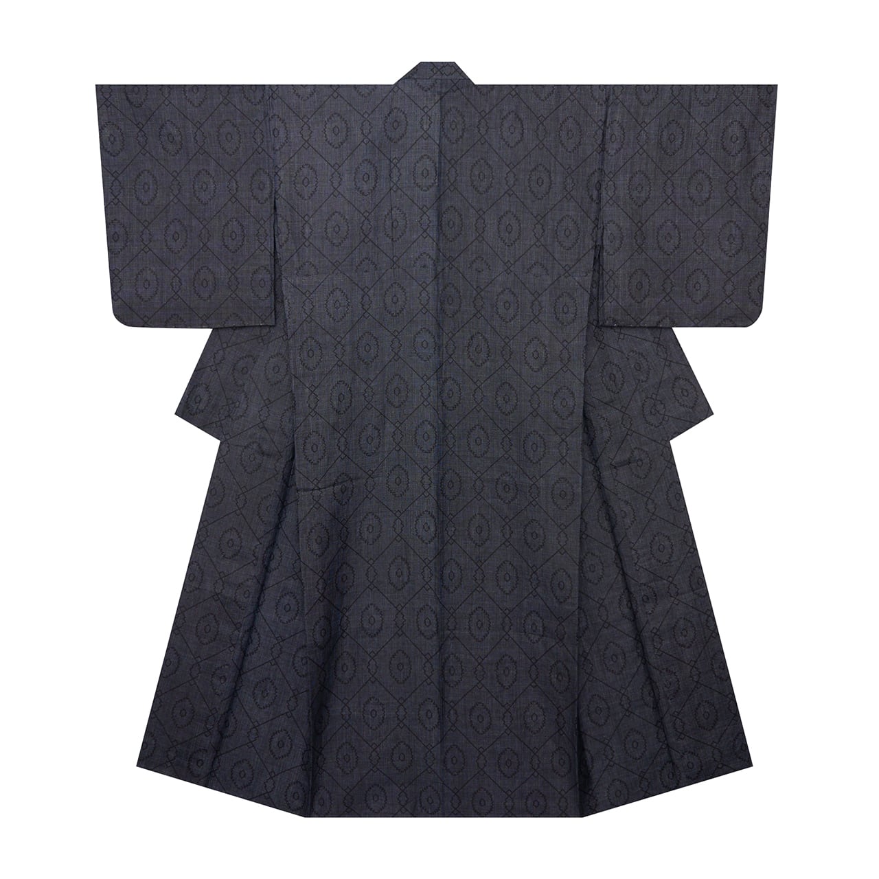 こちらのお着物はとても小さなカ絣で模様が構成されていて、大きな菱の模様が組み合わさったように並んで、その中にお花のような模様が織り出されています。