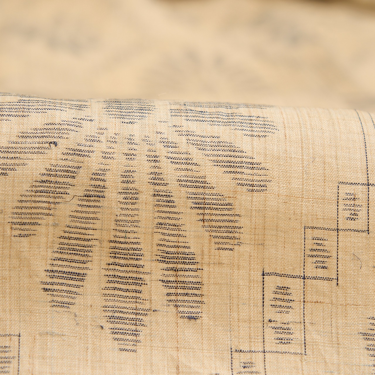 模様の構成が少し珍しく感じられますが、小さな四角の縦横の絣を懸命に合わされているところや、その中にも別の模様が置かれているところなどに、制作者のこだわりと工夫と努力が見て取れ、工芸的なものが持つ良さが感じられます。