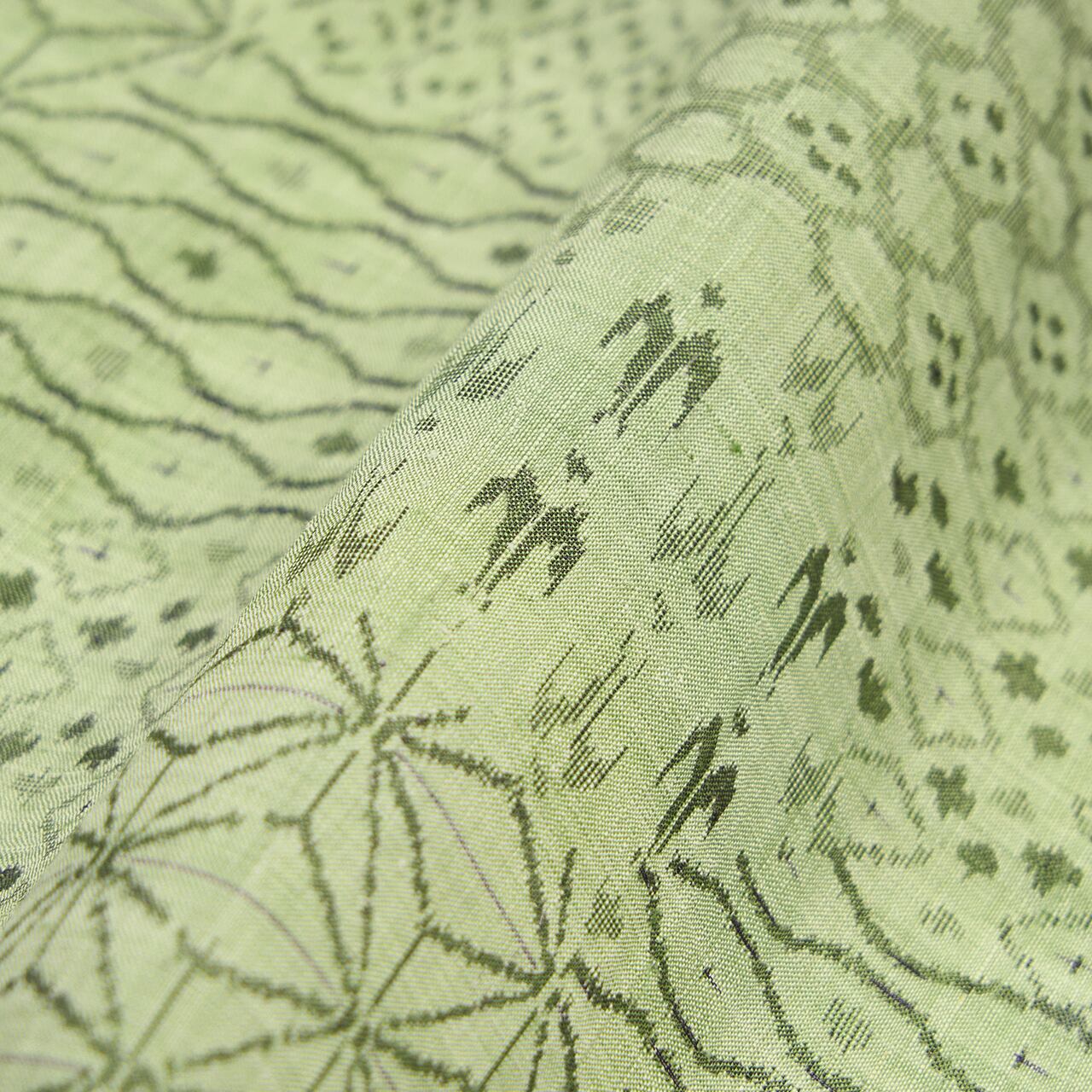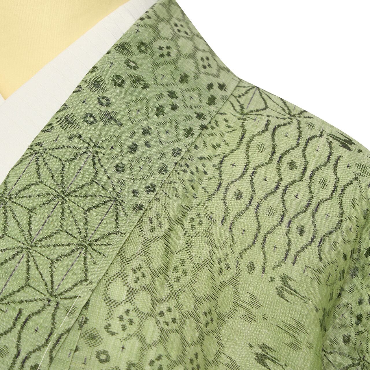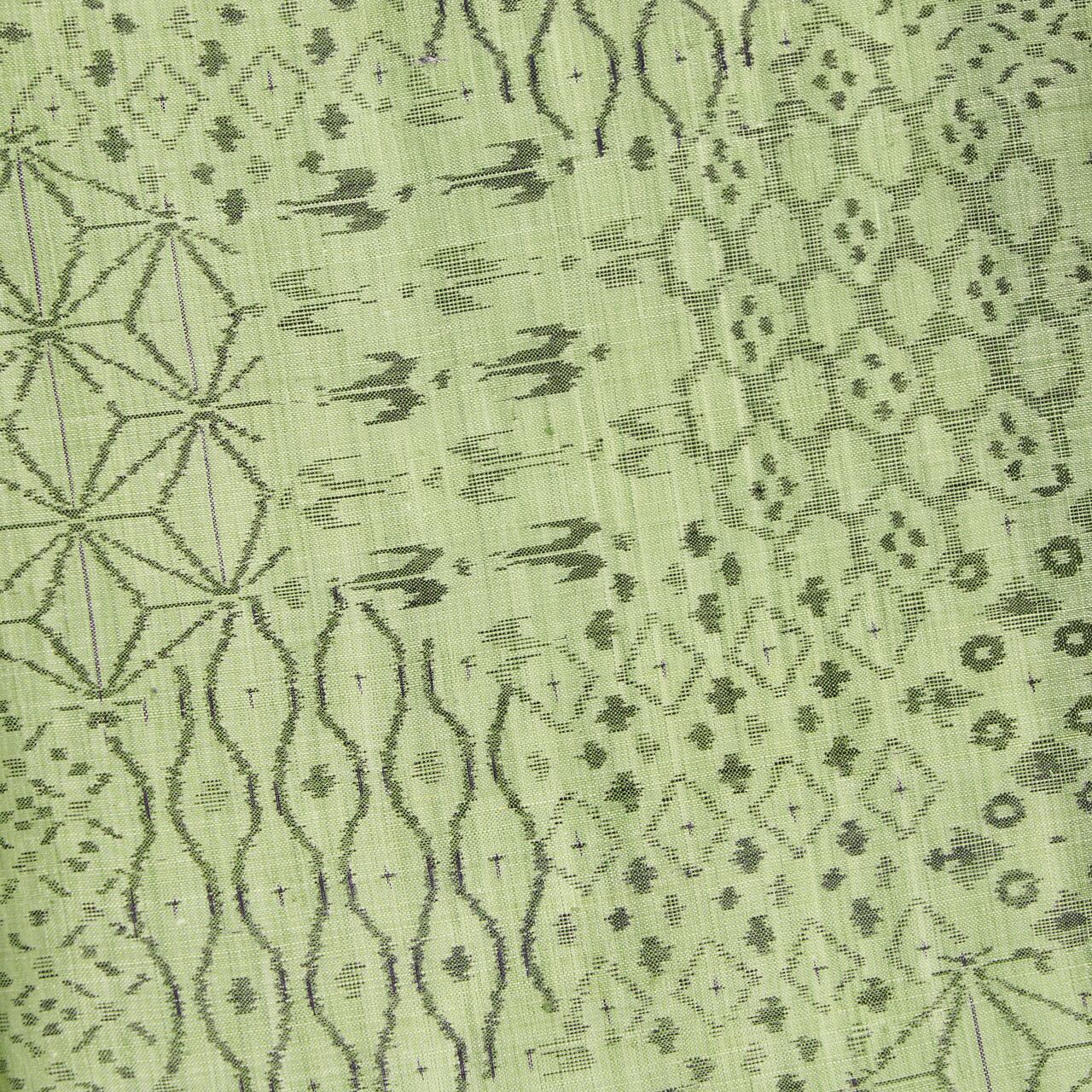 こちらは独特の越後上布の質感と、透明感のある澄んだ薄緑・山葵色がとても美しい地に、中型の亀甲の模様が取られ、その中に、ツバメ、麻の葉、立涌文様、菱模様、お花の模様など、いろいろな模様が寄せ裂のように絣で織り出された、大変手の込んだ凝った模様の越後上布のお着物です。