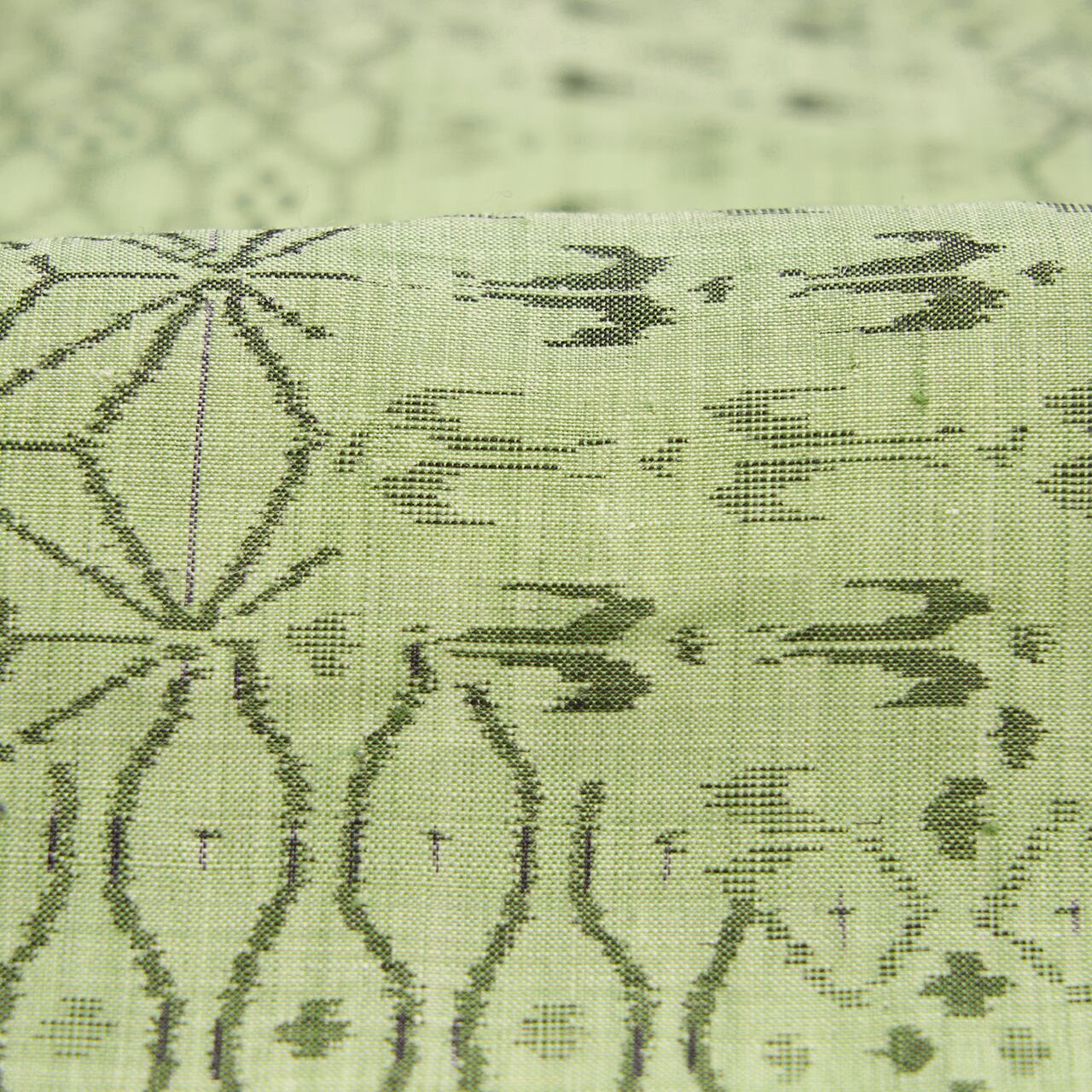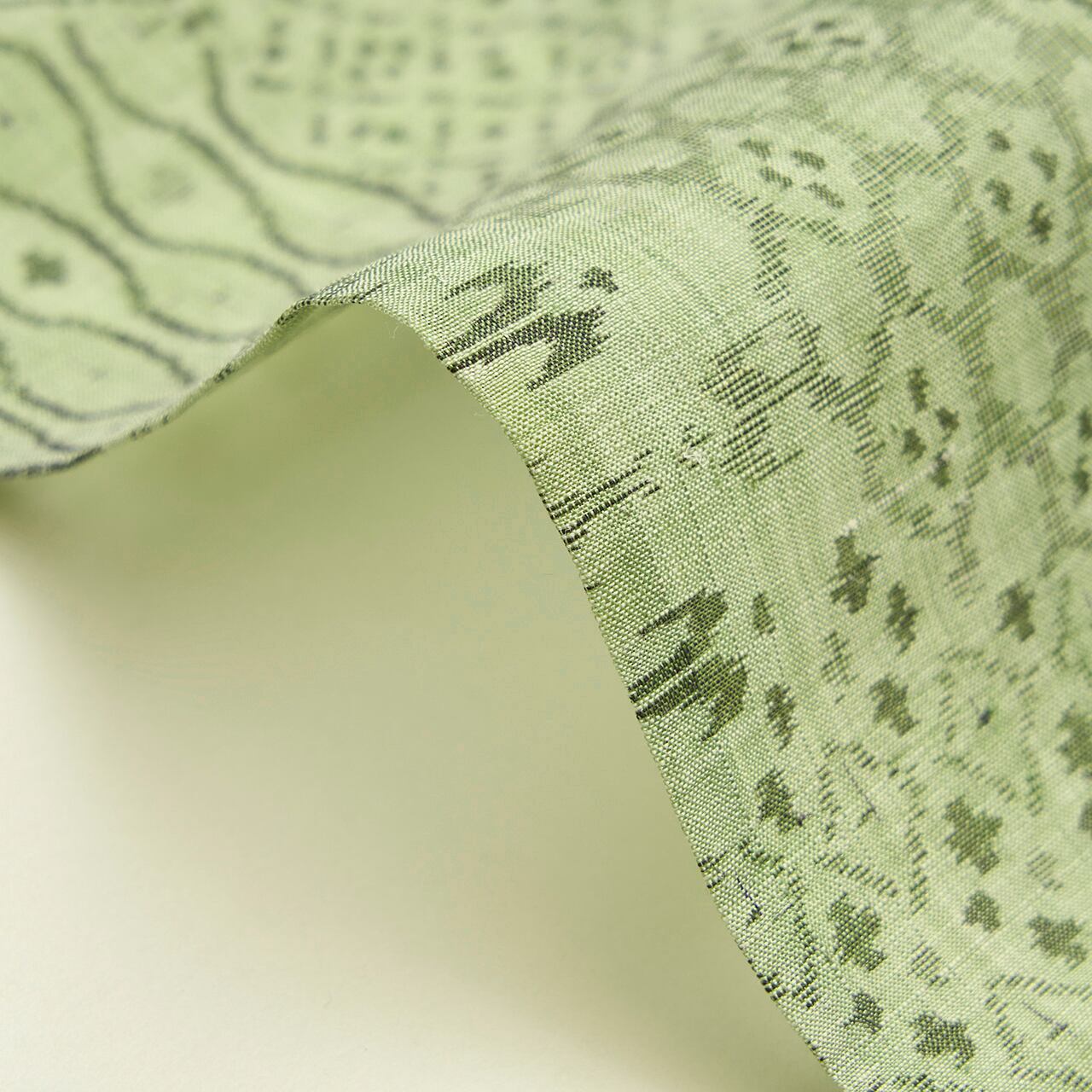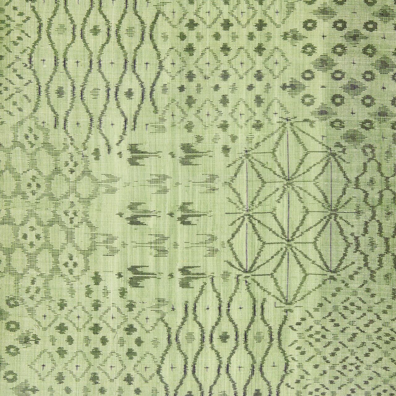 こちらは独特の越後上布の質感と、透明感のある澄んだ薄緑・山葵色がとても美しい地に、中型の亀甲の模様が取られ、その中に、ツバメ、麻の葉、立涌文様、菱模様、お花の模様など、いろいろな模様が寄せ裂のように絣で織り出された、大変手の込んだ凝った模様の越後上布のお着物です。