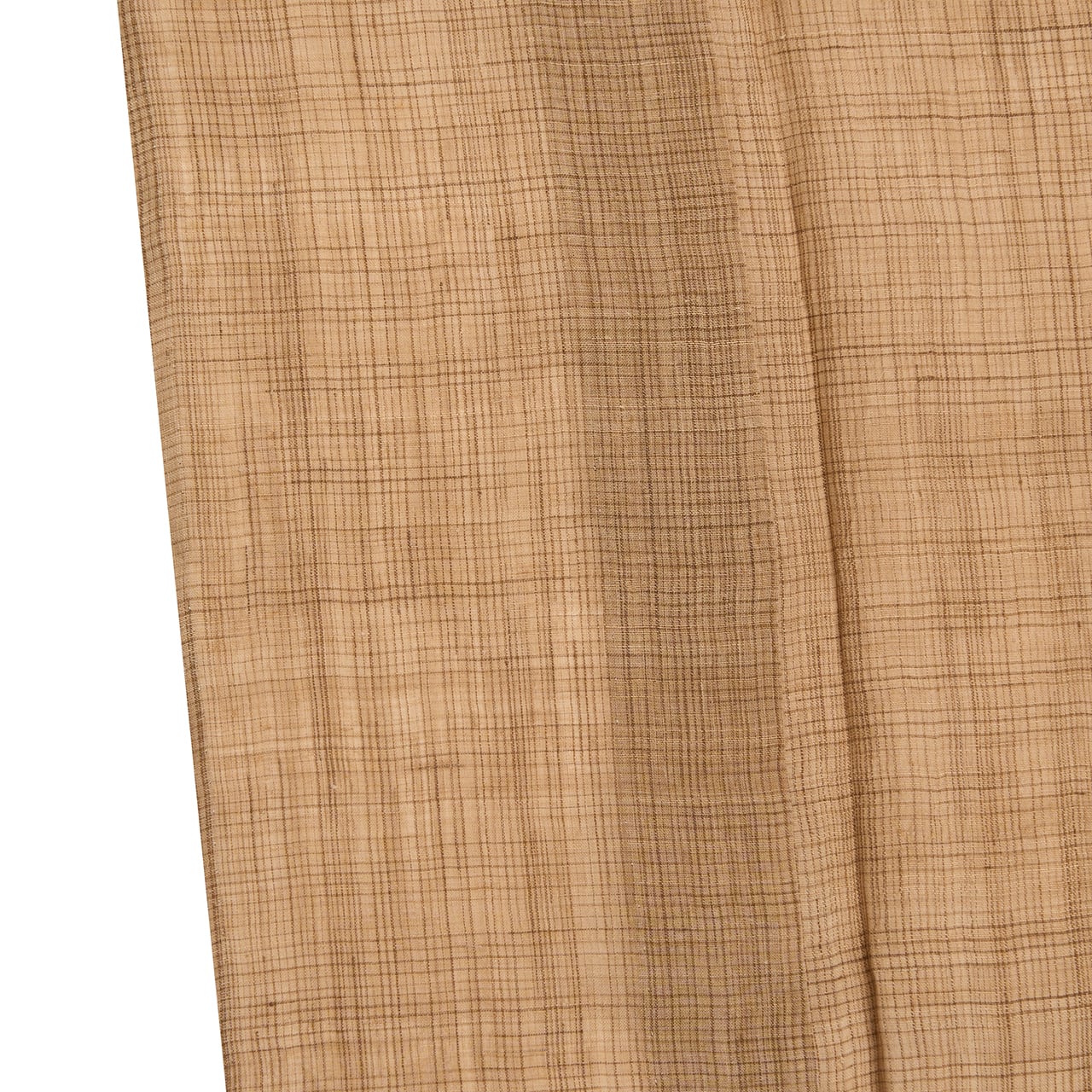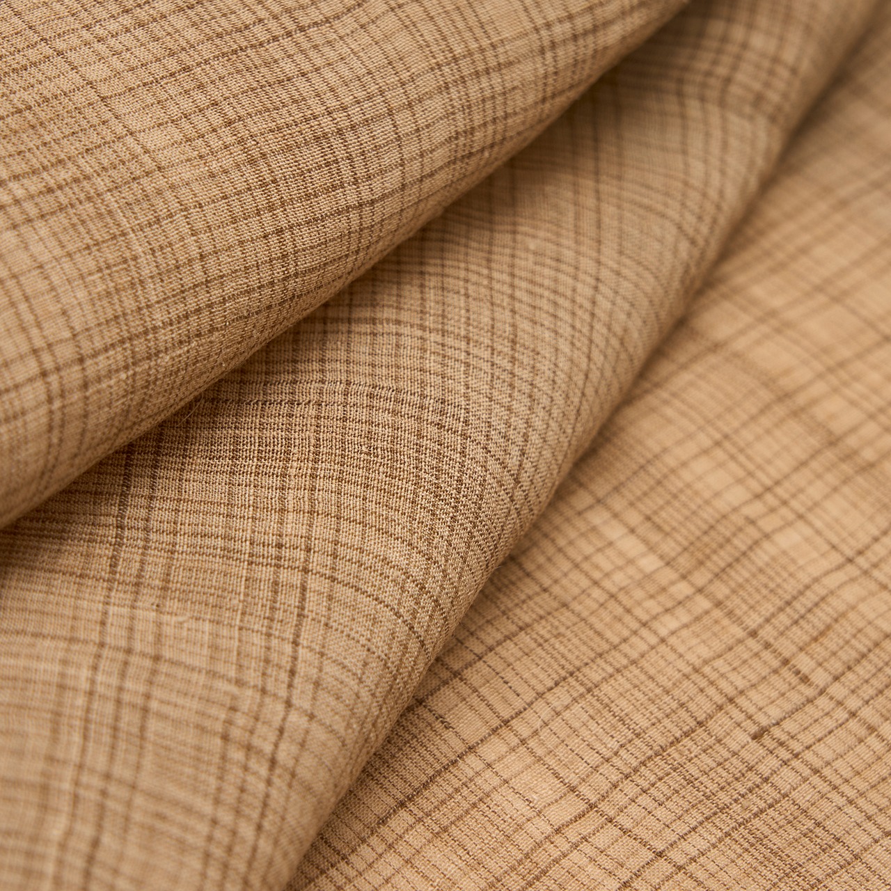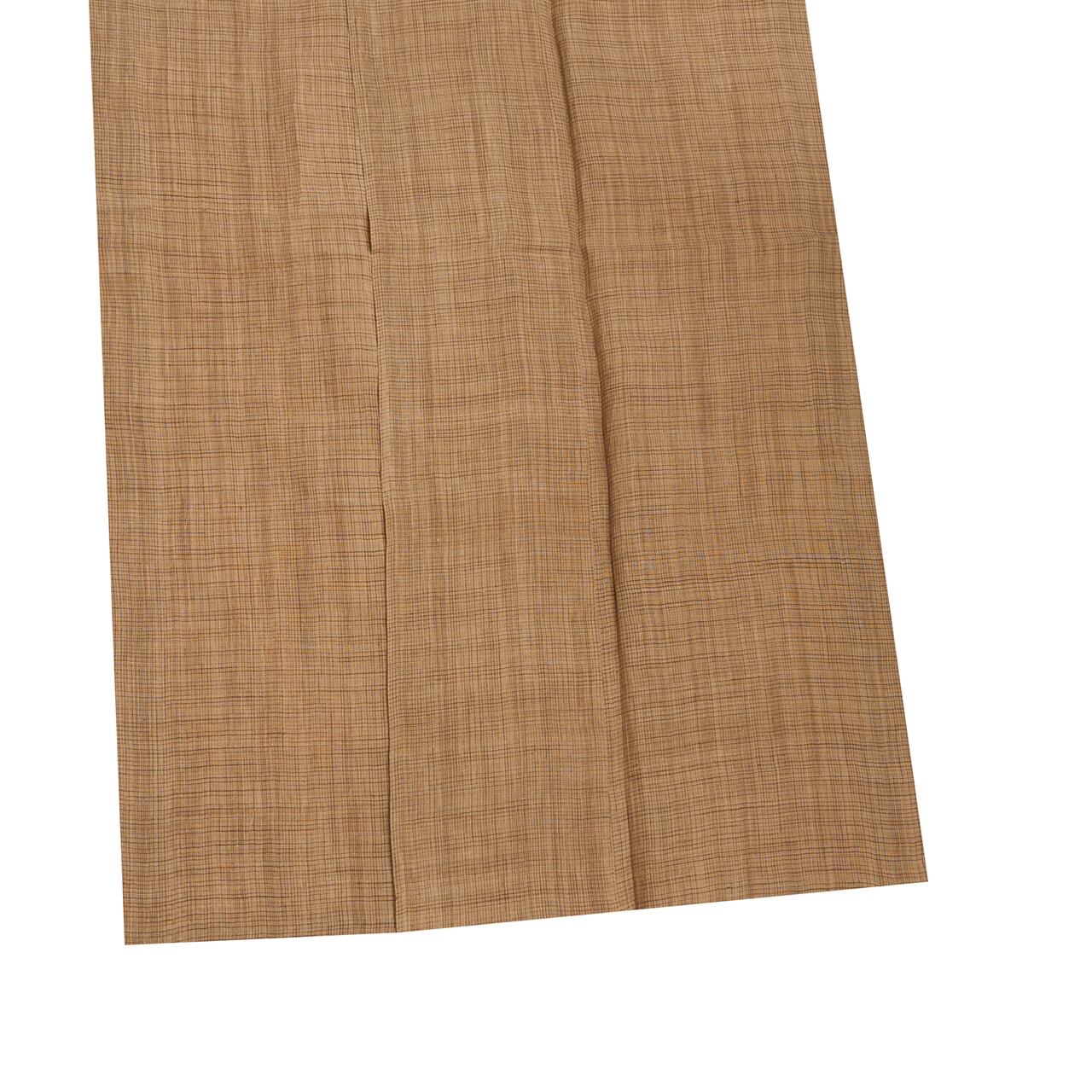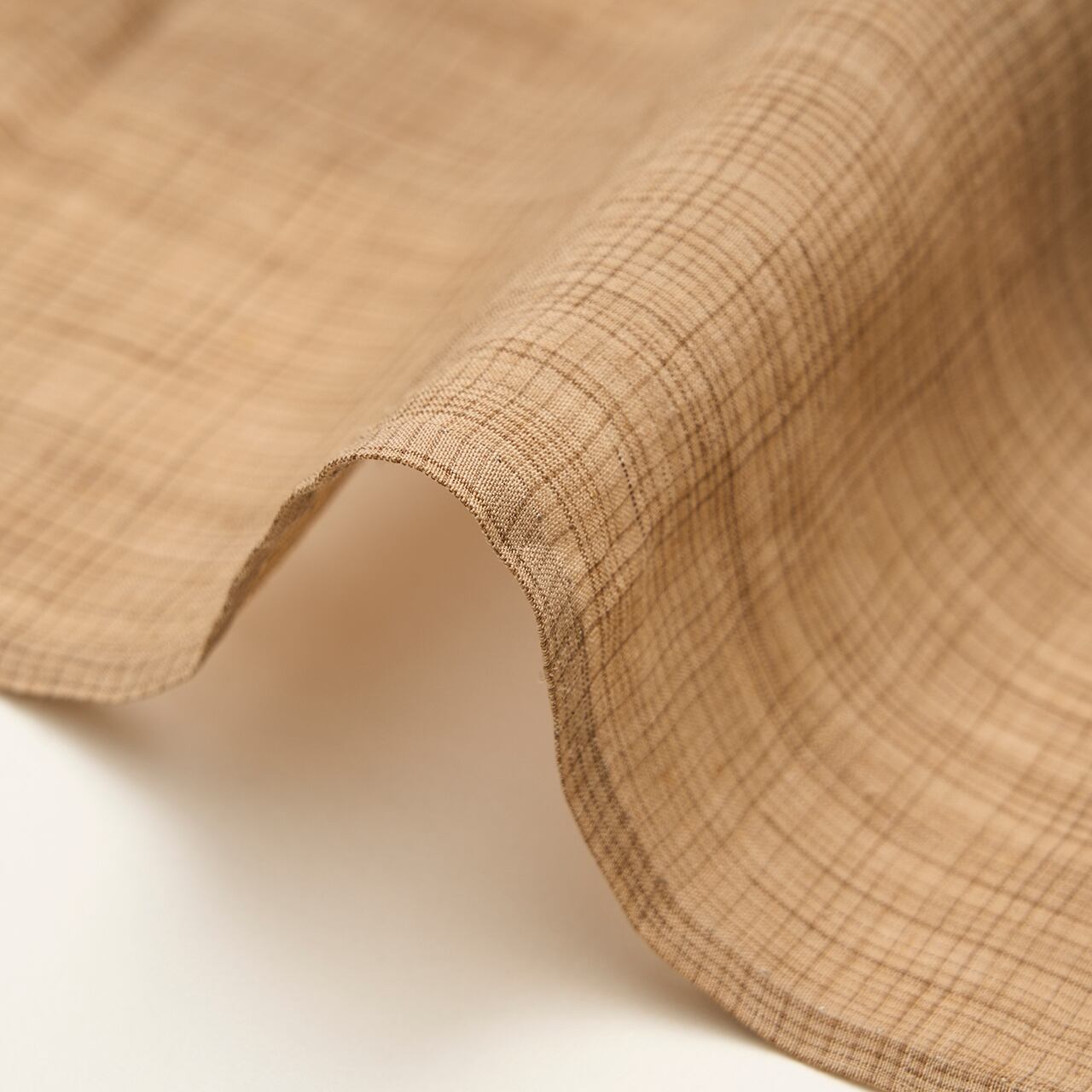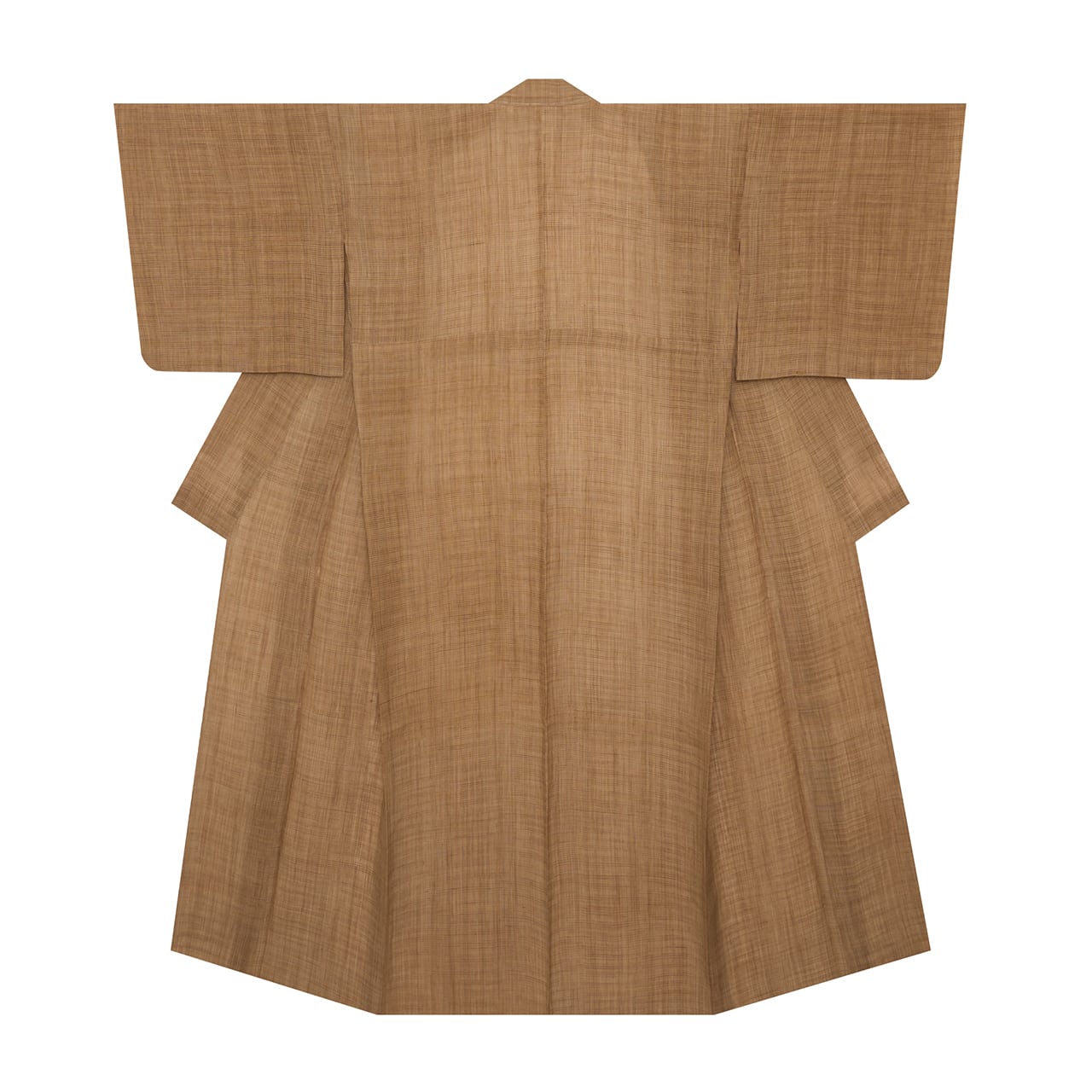透明感のある薄茶・渋紙色の地に、それより少し濃い茶・黄枯茶色の糸で少しランダムなみじん格子の模様が織り出された、無地感覚的なお洒落さのあるお着物です。