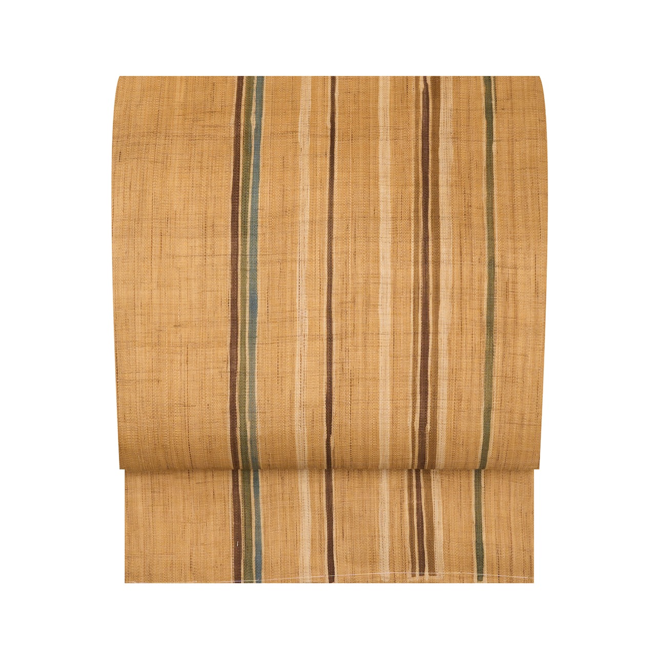 ざっくりとした質感の大麻の生地が、自然のきびらの麻の色より濃い薄茶・黄橡色に染められ、そこに青味のある渋い緑・老竹色や、柴染色の黄色味のある茶、焦げ茶の憲法色、そして白っぽい素色で、縞の模様が手描きで引かれた、すっきりとしたお洒落感のある素敵な夏の九寸名古屋帯です。