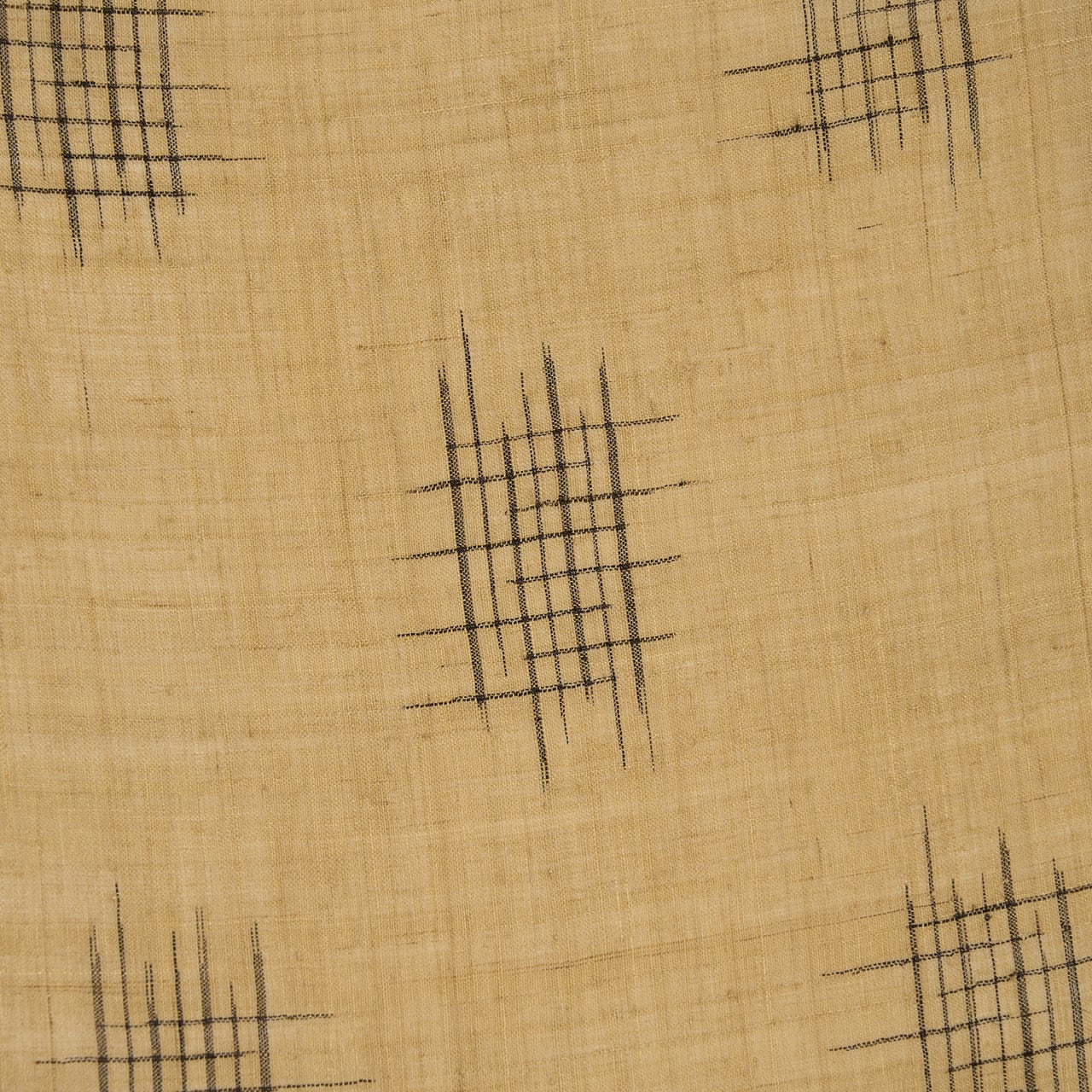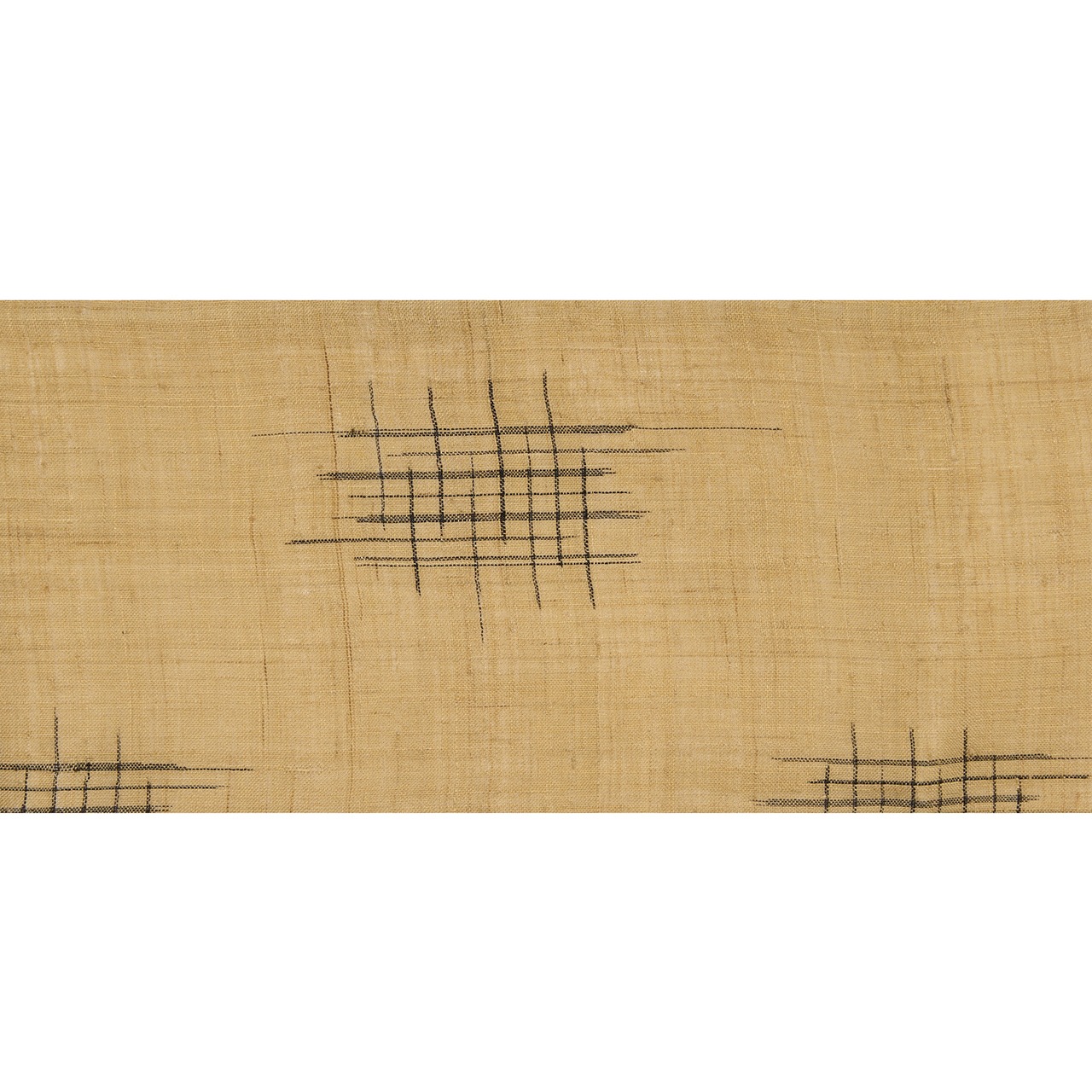 九寸ですが、透明感のある生地ですのであまり重くは感じられず、薄茶・黄橡色の地に手の平くらいの大きさの格子になった四角のかたまりのような絣の模様が織り出されて、少し民芸的な要素もあり、お洒落な雰囲気となっています。